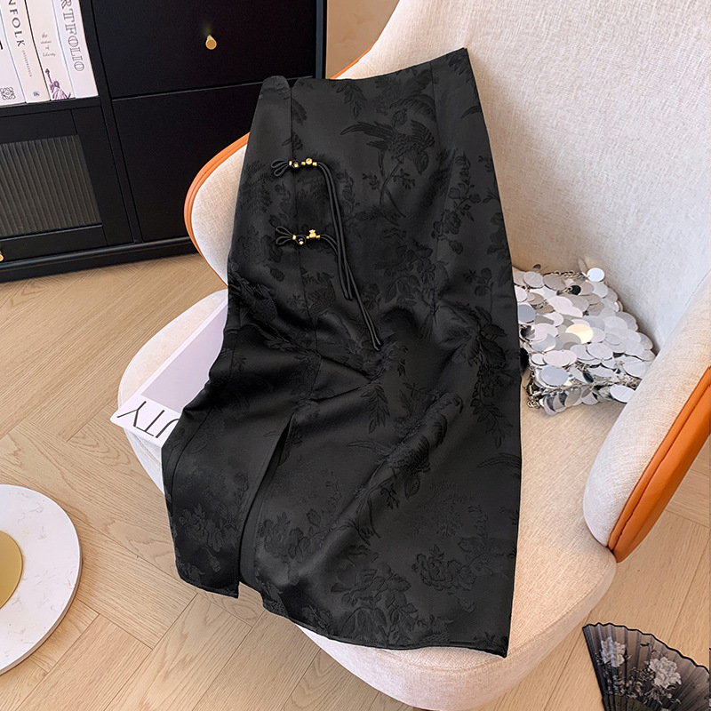 番頭が力を入れて新中国式ジャカードスカート女性2025春型高腰修身a字ストレートスカート国風盤ボタンを押す