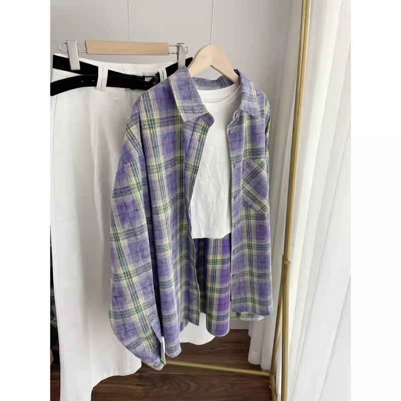 9531 パープルチェック柄シャツ ゆったりオーバーサイズシャツジャケット レディース 2024秋新作 長袖 万能