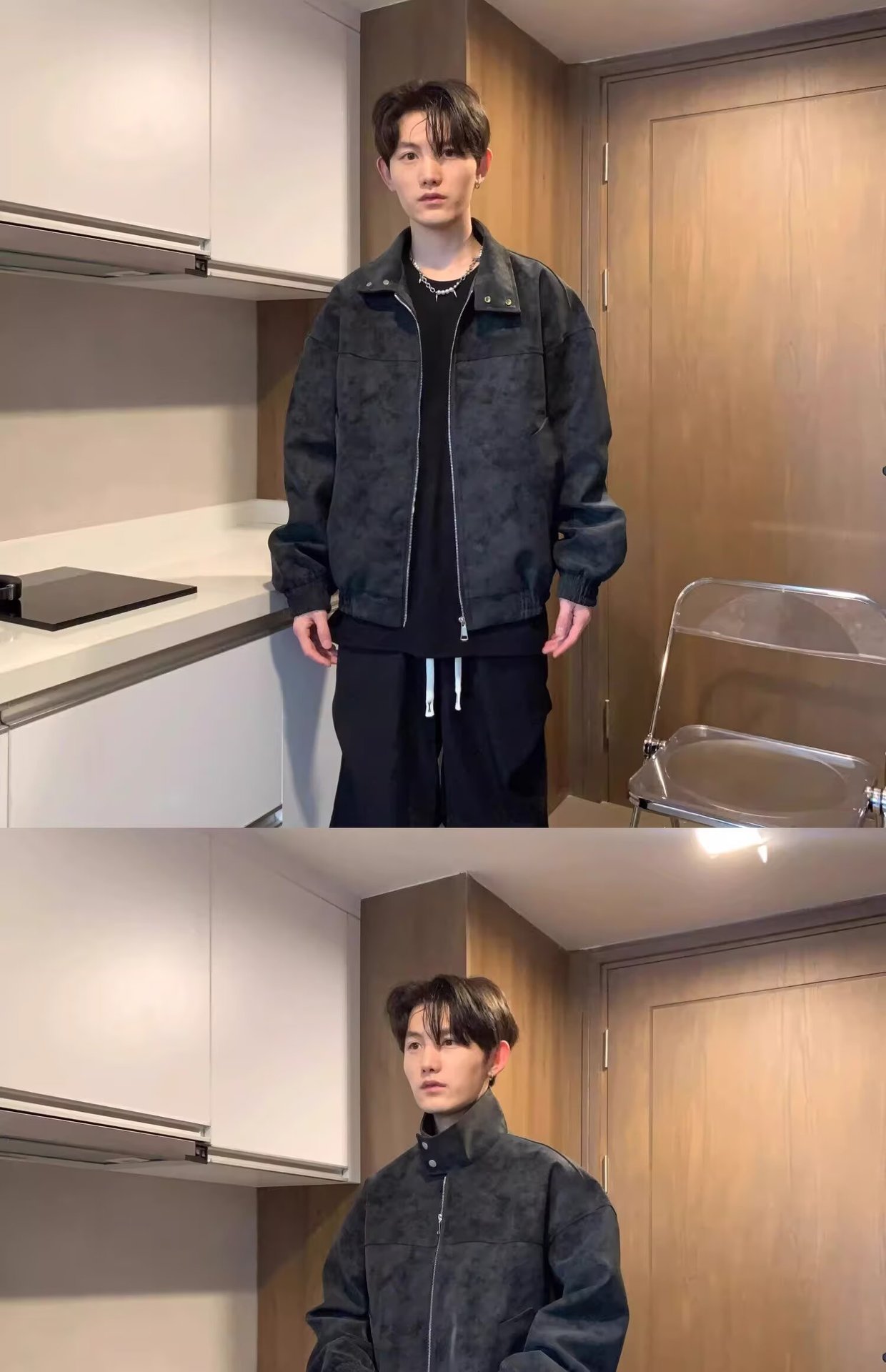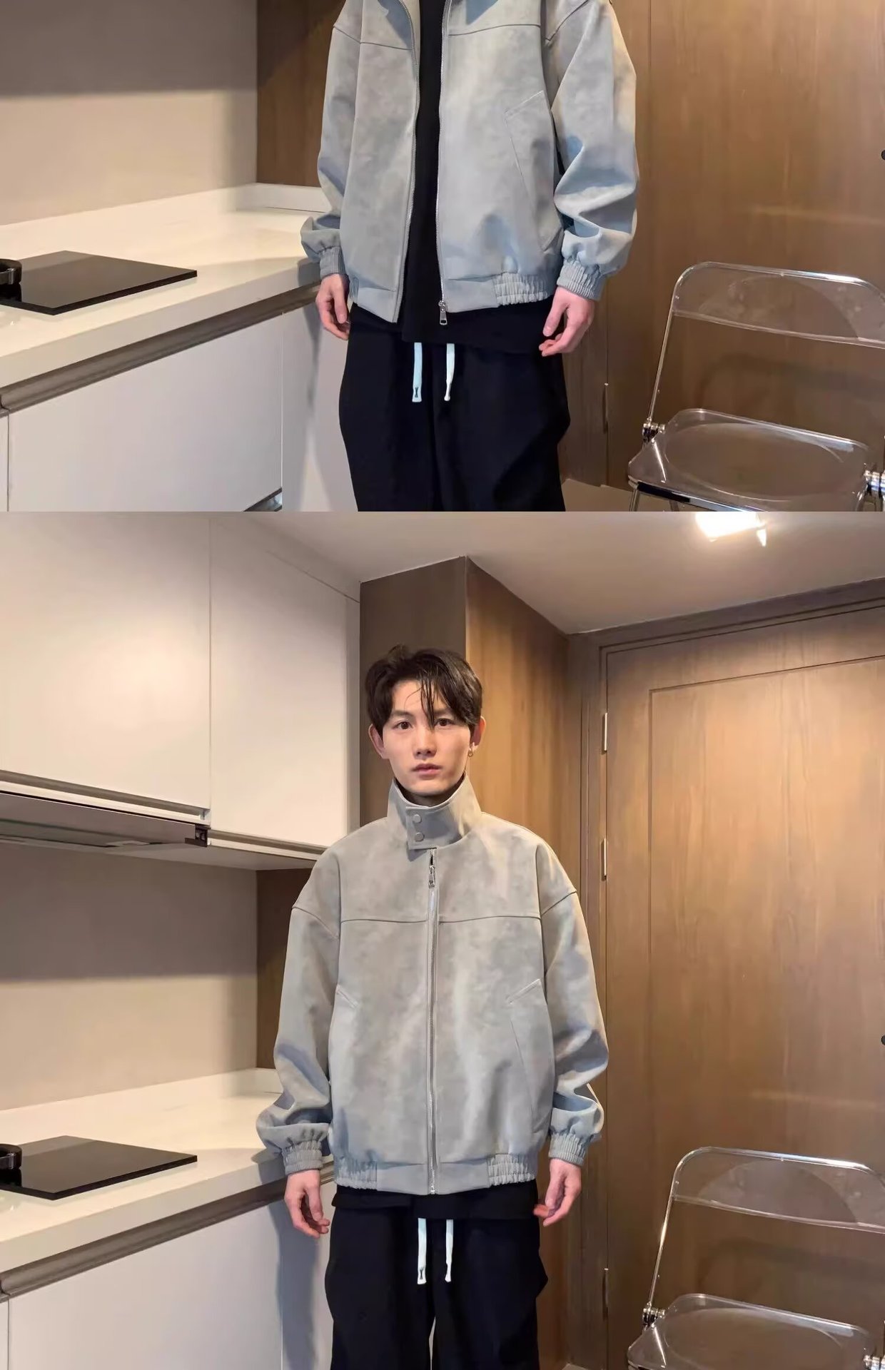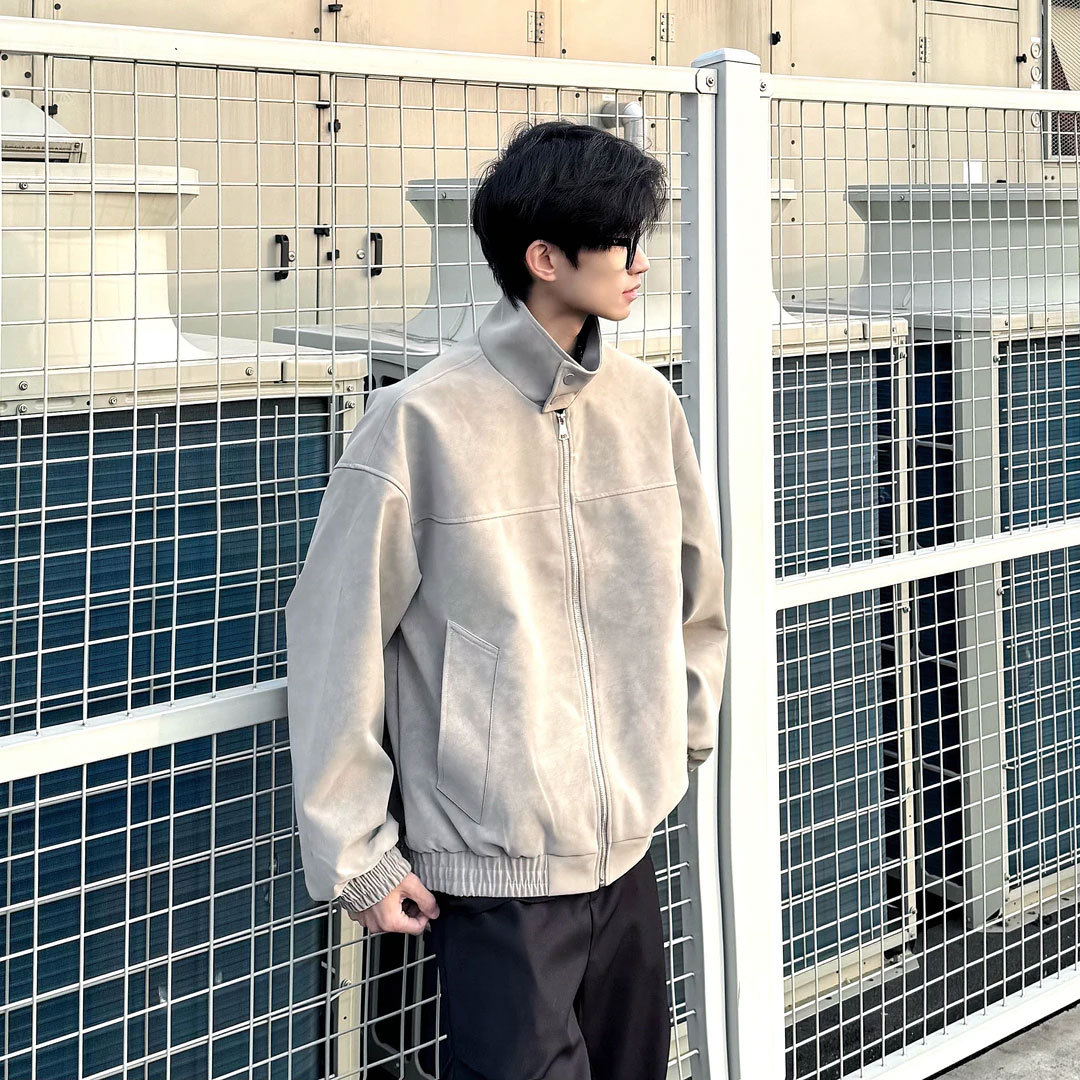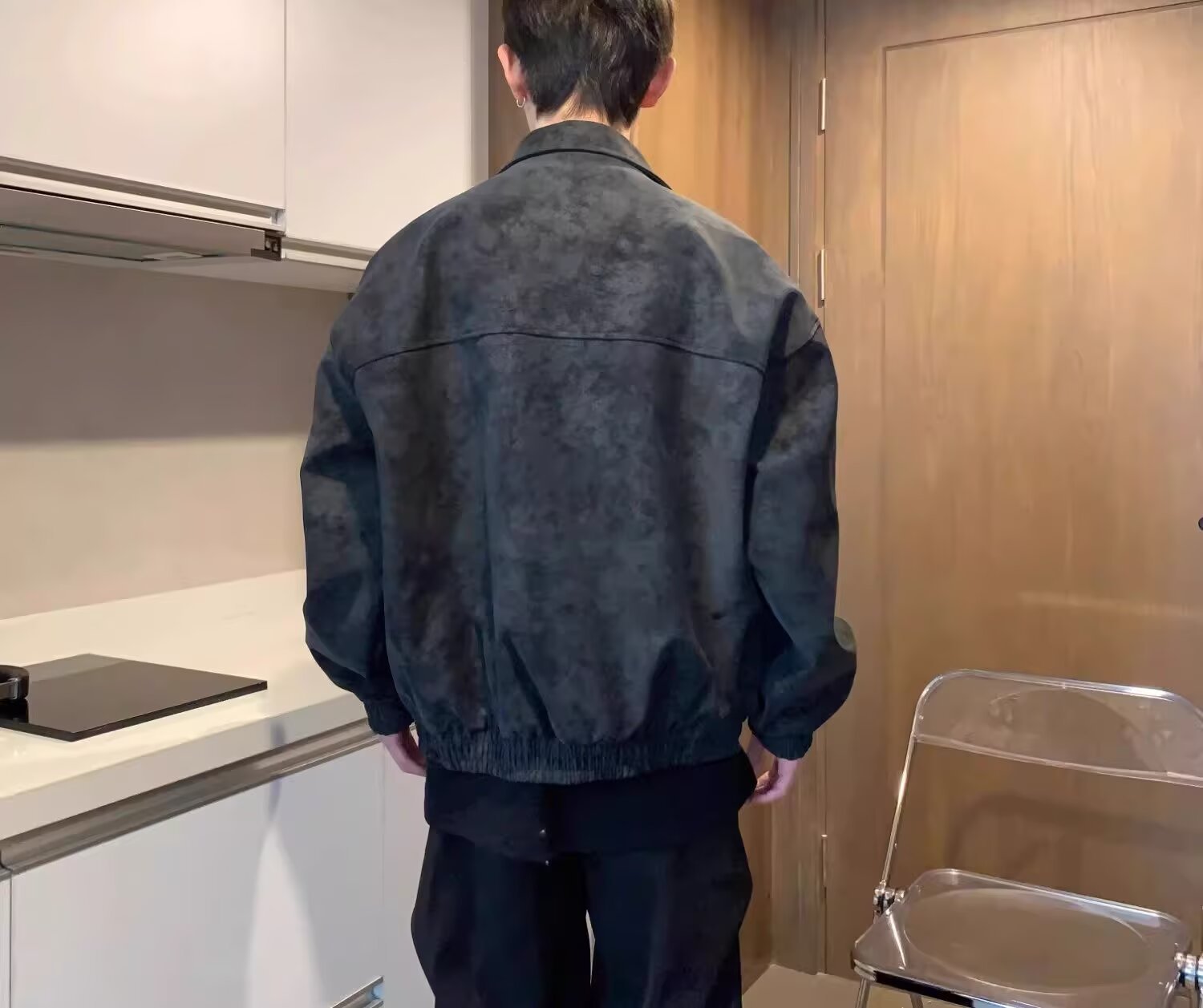 爆款春秋扎染PU皮美式复古立领皮衣夹克宽松百搭情侣外套灰色黑色