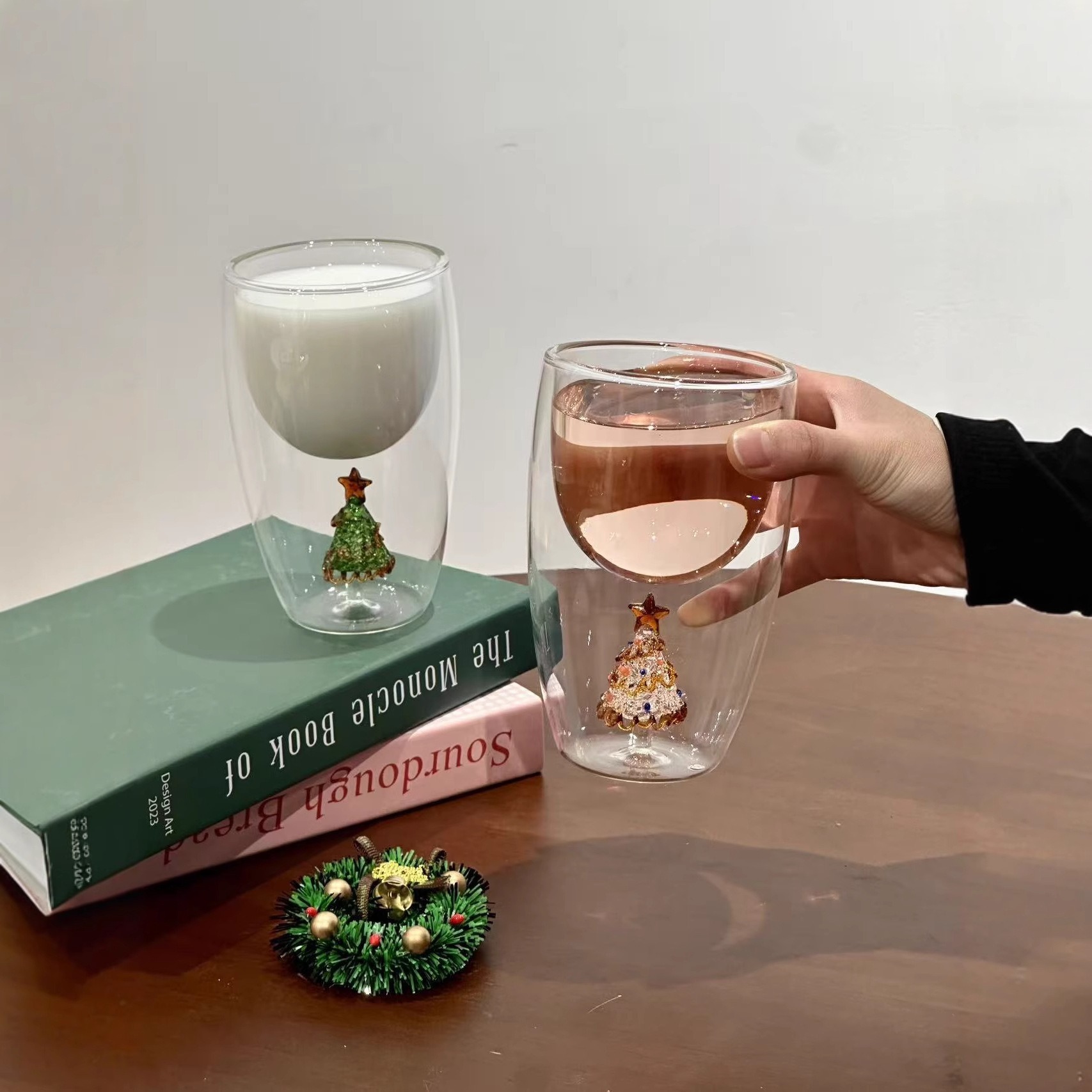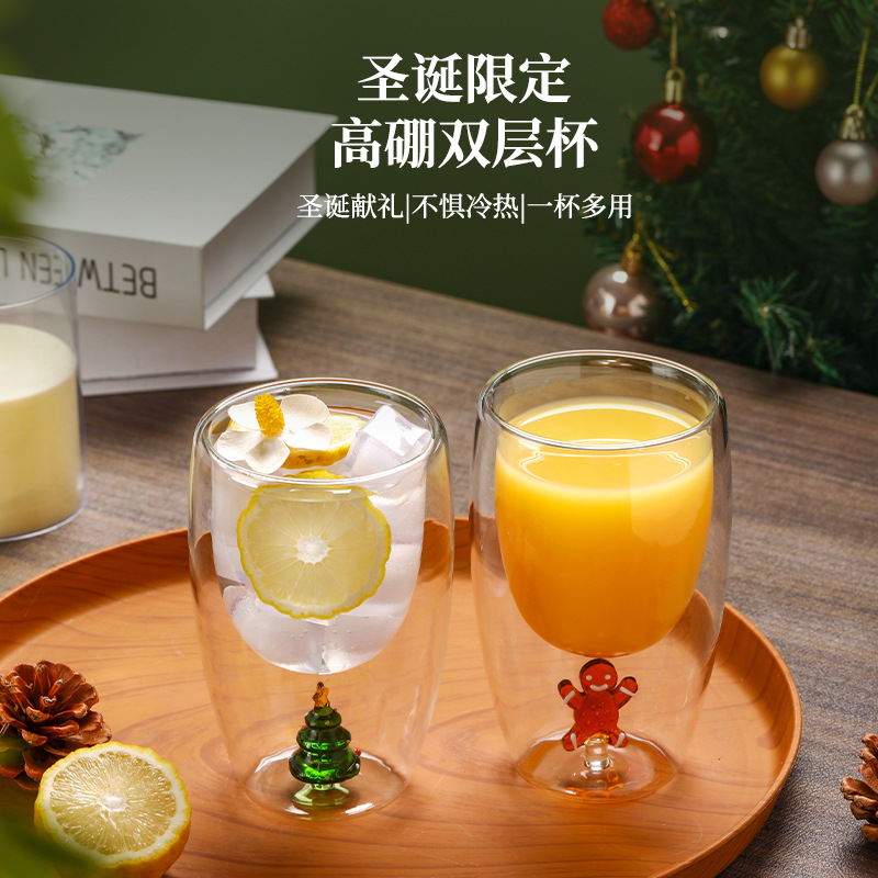 跨境新品双层夹心玻璃杯高颜值节日圣诞风果汁杯透明高硼硅玻璃杯