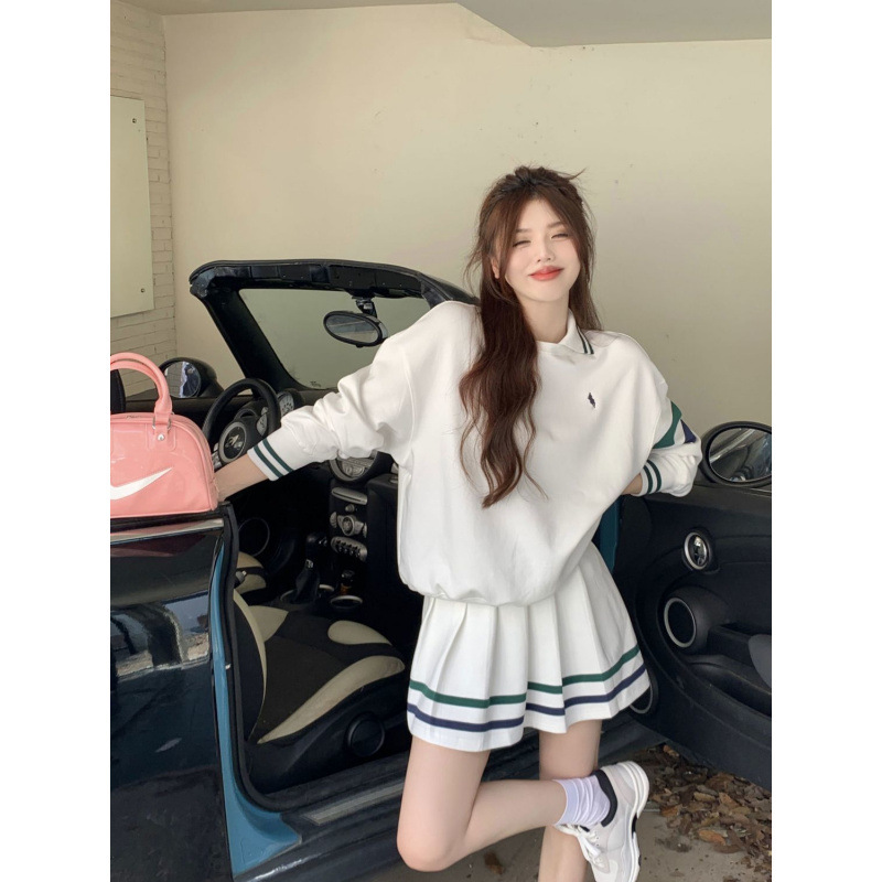 カジュアルスポーツスーツショートスカート春秋ファッションストライプカレッジスタイルスウィートホットガールスウェットシャツプリーツスカート2点セット