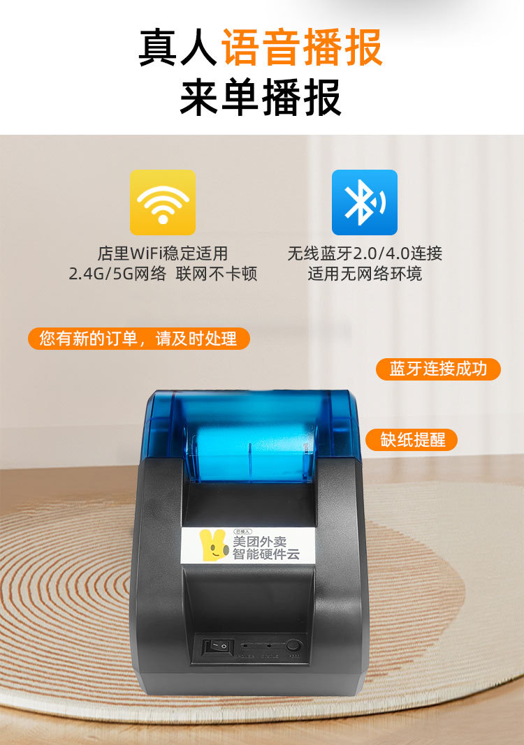注文受付用リアル音声対応テイクアウトプリンター、京東、美団、餃子モール対応、Bluetoothサーマルプリンター、Bluetooth印刷