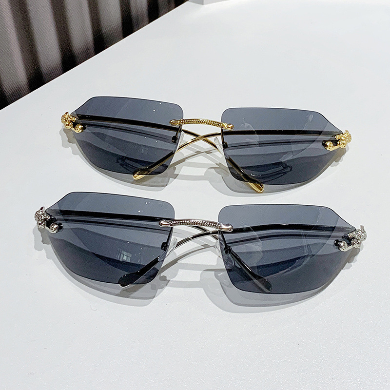 国境を越えた新作フレームレスヒョウ柄メガネキャットアイサングラス高級感ファッションメタルサングラス女性向け卸売