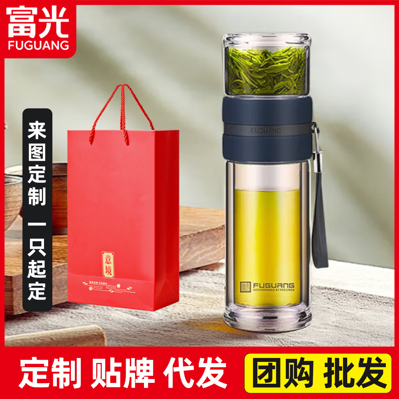 富光二重グラス茶水分離泡カップ携帯カップフィルターカップ印字ロゴ卸売り
