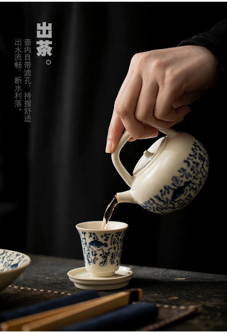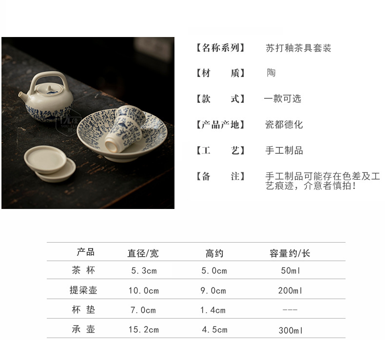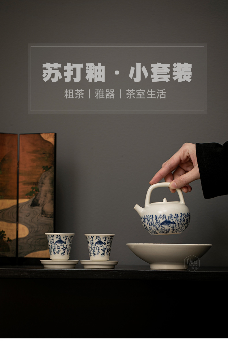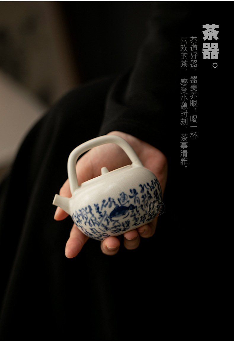 小さなカンフー茶セット、釉薬入り青と白のハンドル付きポット、ポット 1 個とカップ 2 個、オフィスの受付ティーセット、ギフト