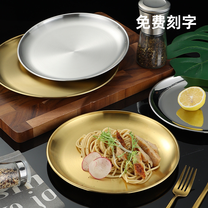レトロな古い韓国ステンレス鋼ディスクカフェトレイフルーツプレートデザート浅いプレートキャンプスタイルカスタムロゴ