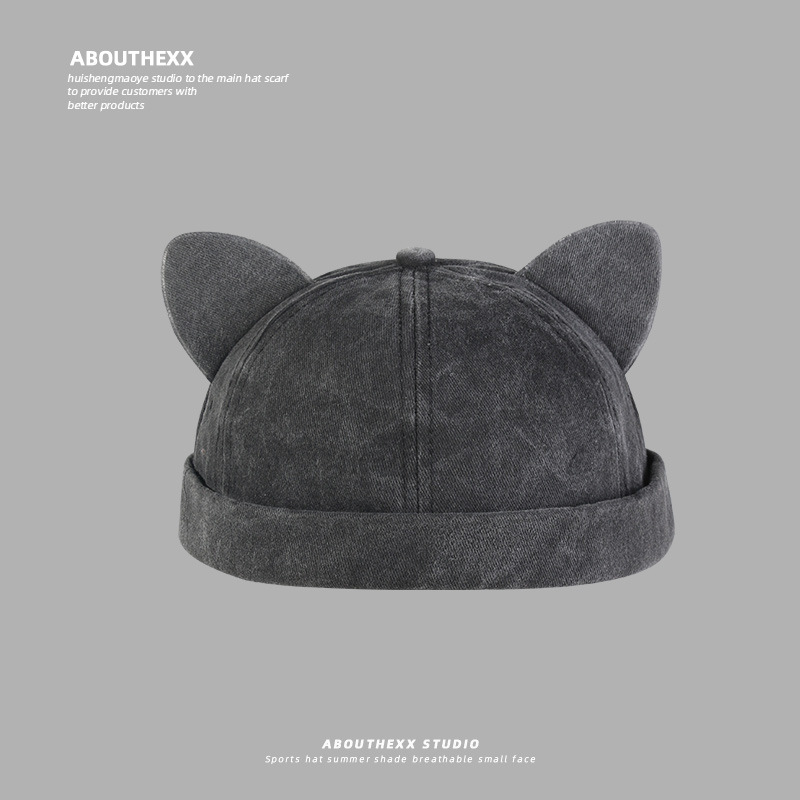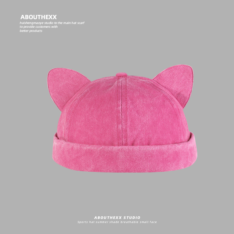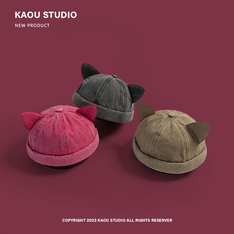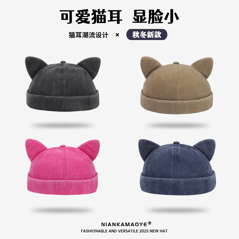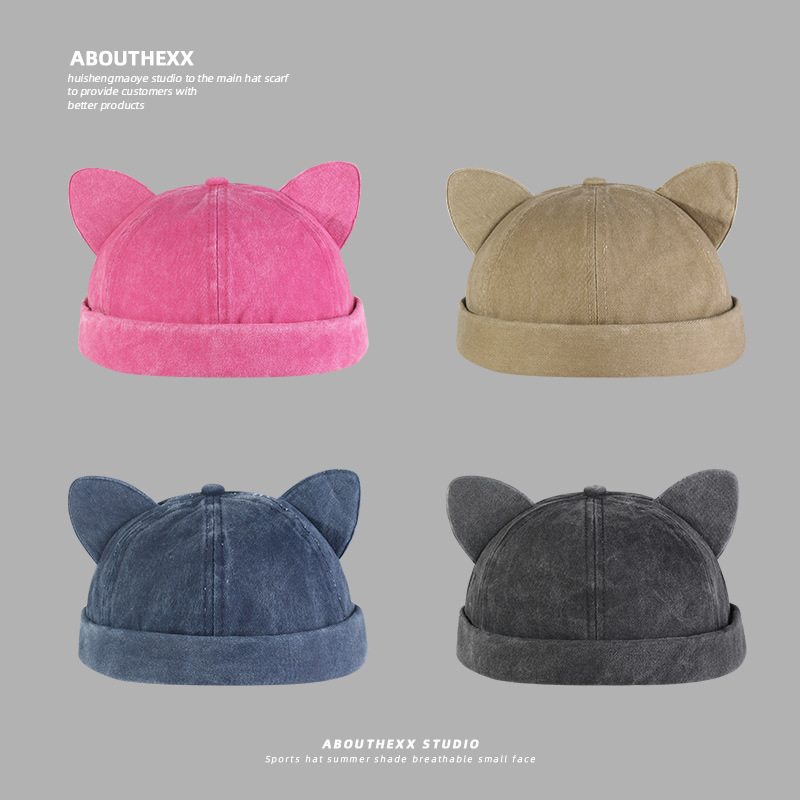 跨境爆款帽子女可爱猫耳朵无檐地主帽水洗做旧瓜皮帽雅痞帽子男潮