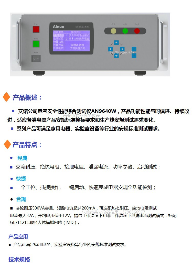 青島アイノ安全規格耐電圧総合試験器 AN9640W 電気 PLC 機器性能総合試験器リークメーター