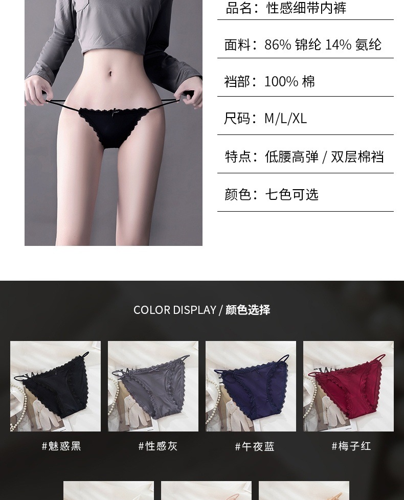 女性用セクシーなアイスシルク下着、細いストラップ、ローウエスト、純綿、レースのリボン、薄くて快適な女の子用ブリーフ