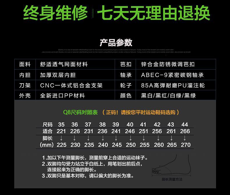 颜色 Q8黑绿色单鞋,Q8黑绿色+护具+鞋包,Q8黑紫色单鞋,Q8黑紫色+护具+鞋包,007黑金色单鞋,007黑金色+护具+鞋包,007白黑色单鞋,007白黑色+护具+鞋包,S60黑白色单鞋,S60黑白色+护具+鞋包,S60黑蓝色单鞋,S60黑蓝色+护具+鞋包,M8白黑色单鞋,M8白黑色+护具+鞋包,断码清仓款
