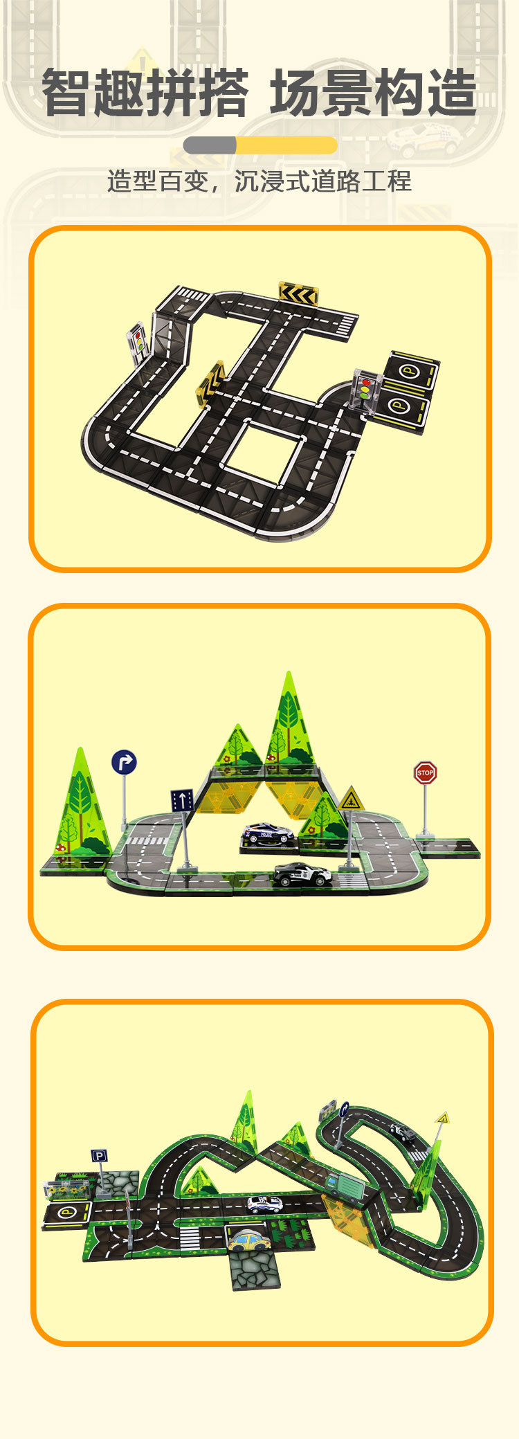 跨境彩窗磁力积木7.5C兼容印刷道路城市交通建筑吊车构建片磁力片