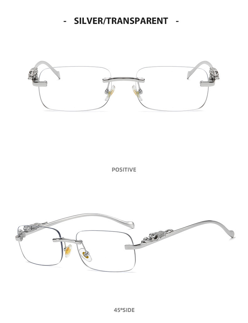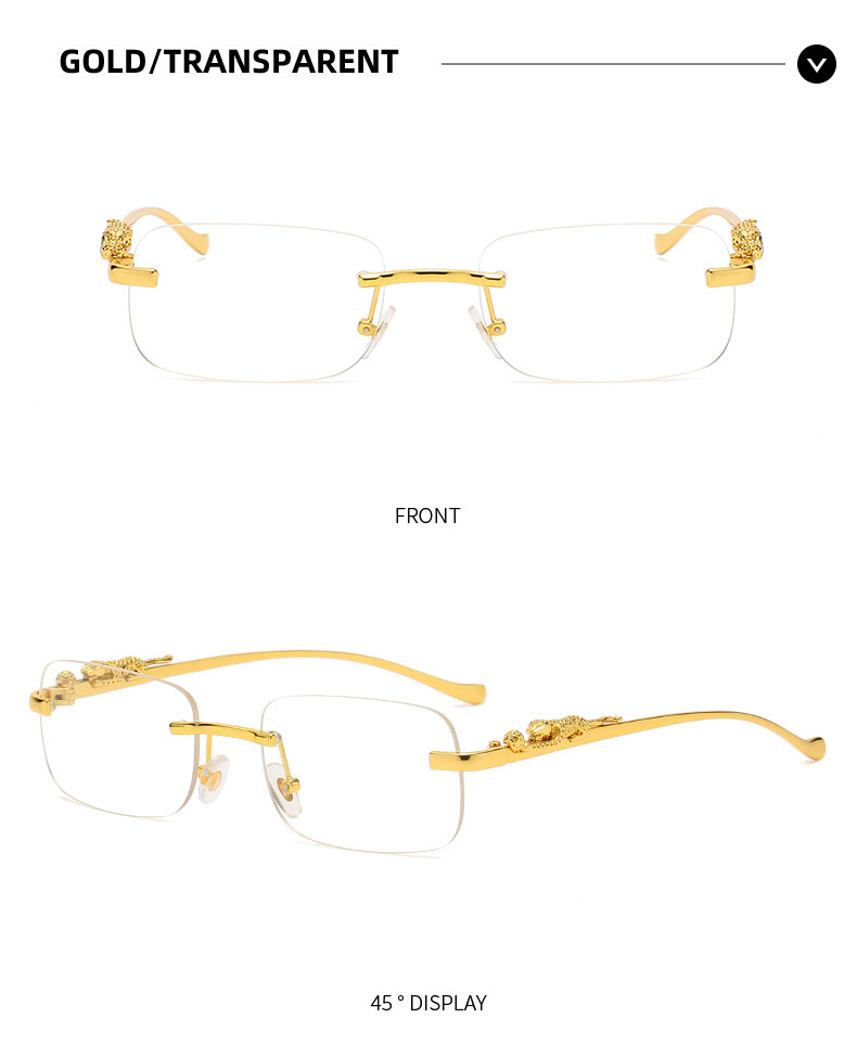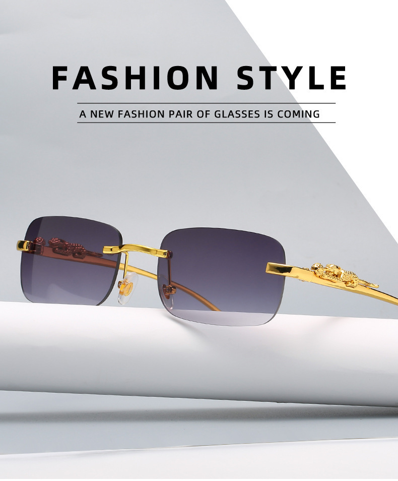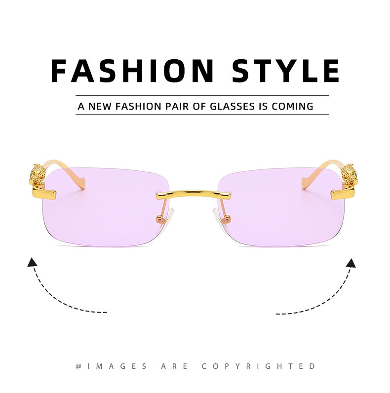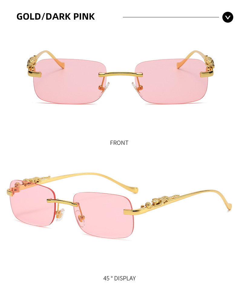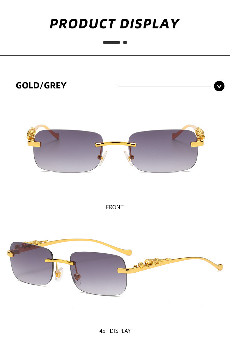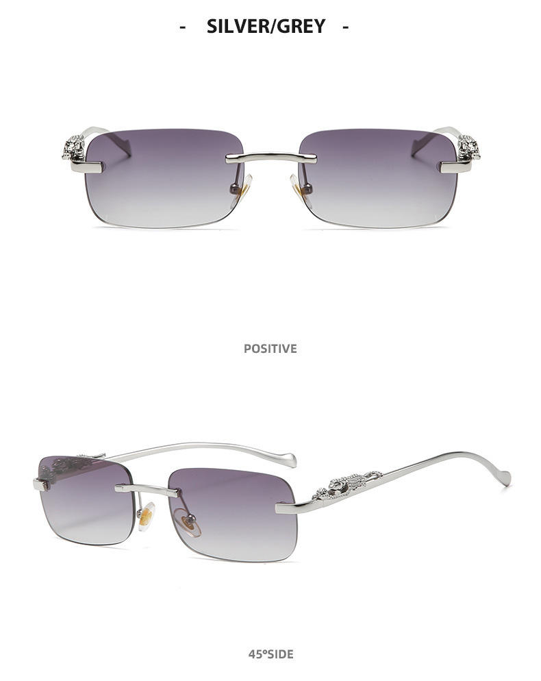 男性と女性のための新しいフレームレススクエアサングラス、レトロなチーター装飾サングラス、クロスボーダーヒョウヘッドメタルサングラス