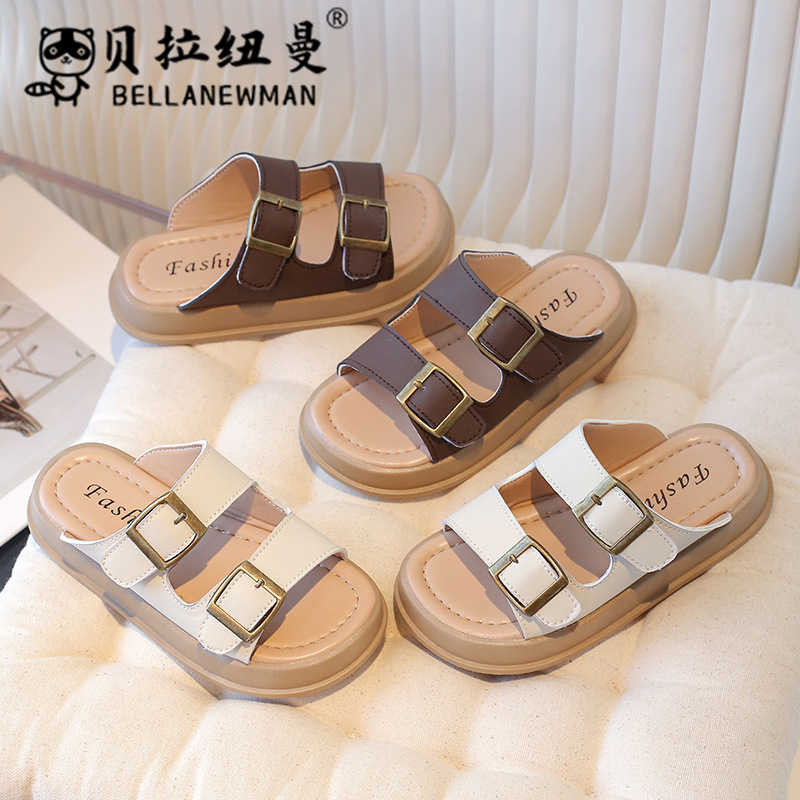 クロスボーダー児童スリッパ皮面レジャーサンダル2025夏の新型児童一字引き学生ビーチシューズ