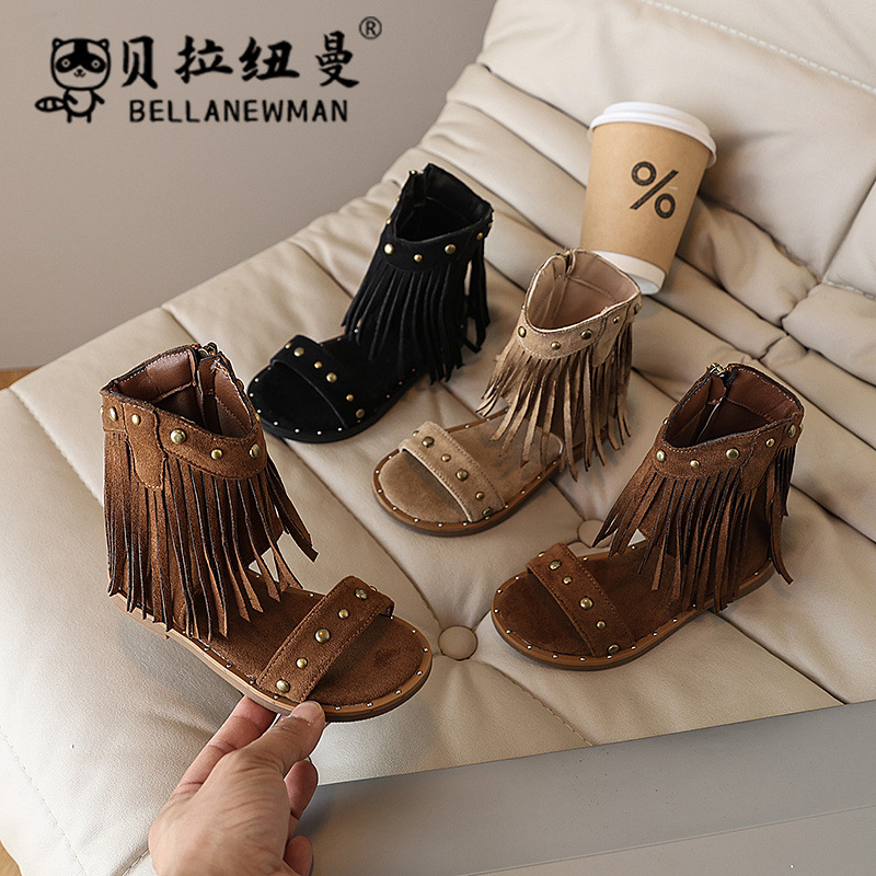 外国貿易サンダル2025夏の新型女の子ファッション一字ローマ靴付き西米亜風流蘇児童サンダル