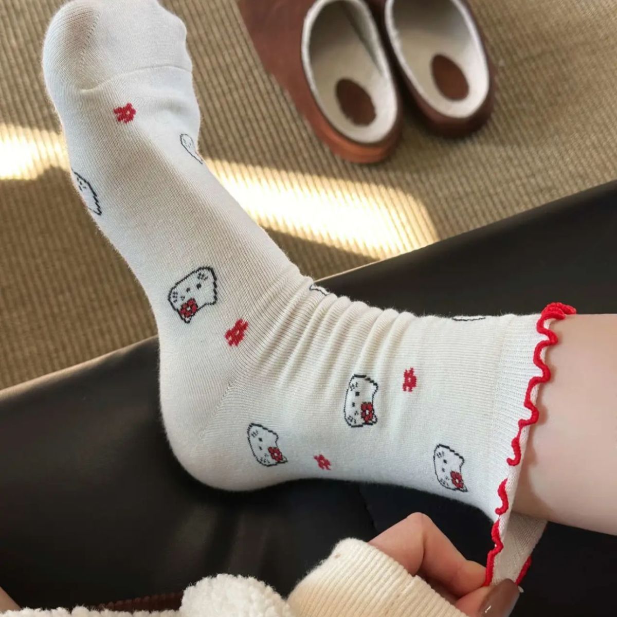 韓国の楽しい赤い全身レースミッドカーフソックス春と秋のガーリーで甘くてかわいい新年の女性の靴下