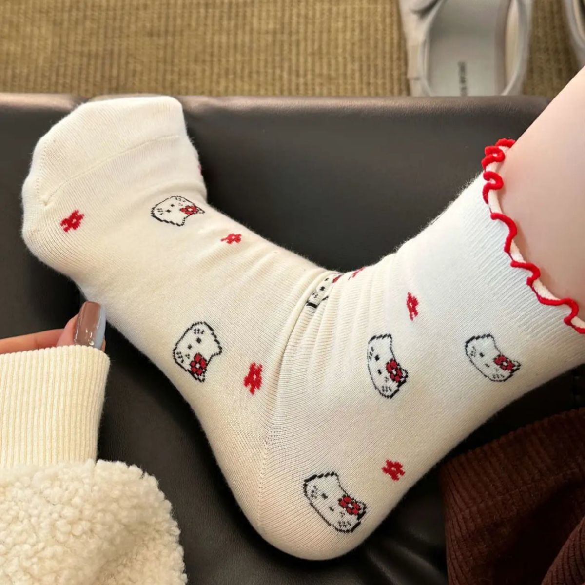 可爱猫咪大红新年红袜子女少女感猫咪蝴蝶结点子纱中筒袜鸿运袜