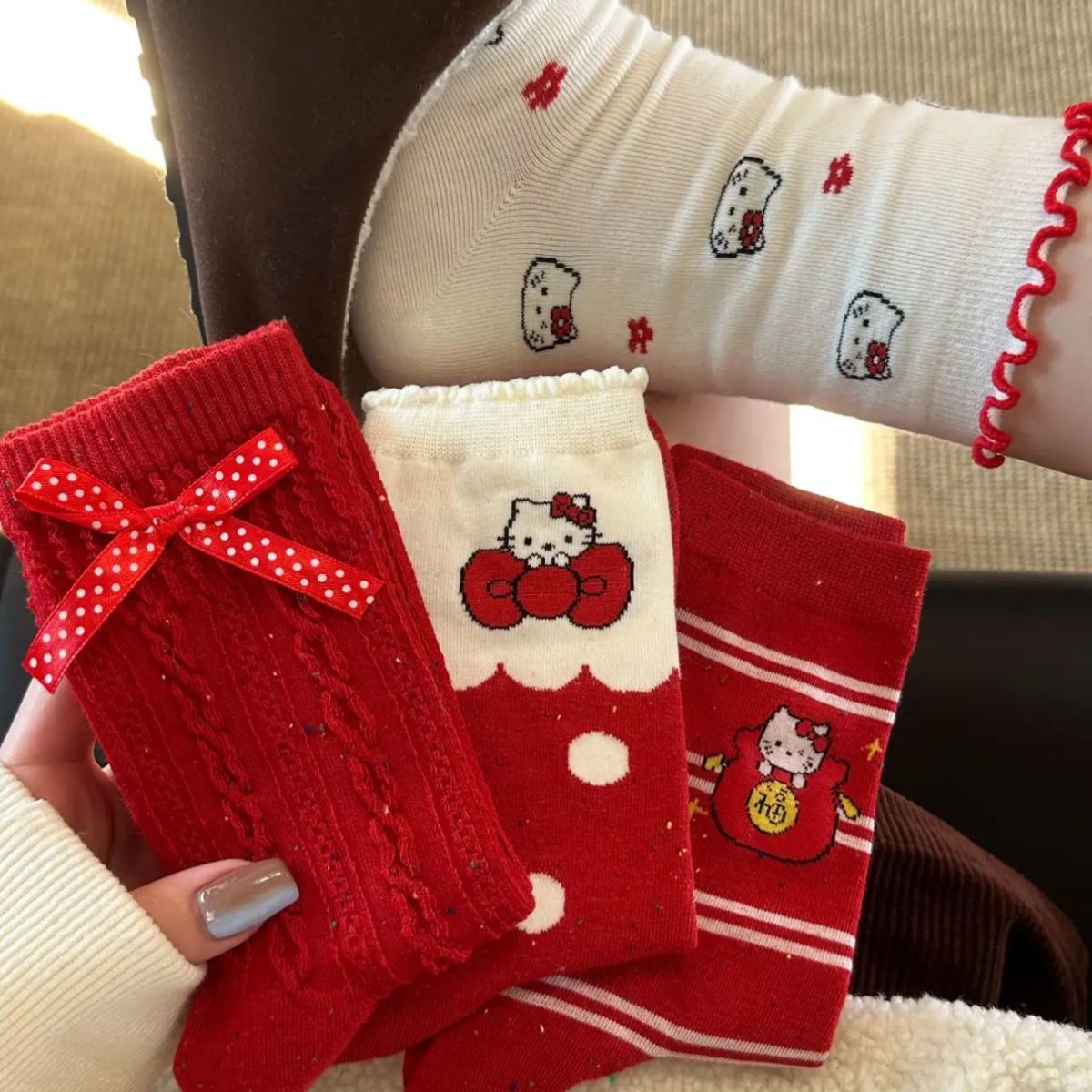 本命年結婚大紅靴下女子秋冬安可拉紅猫蝶結び靴下中筒綿靴下