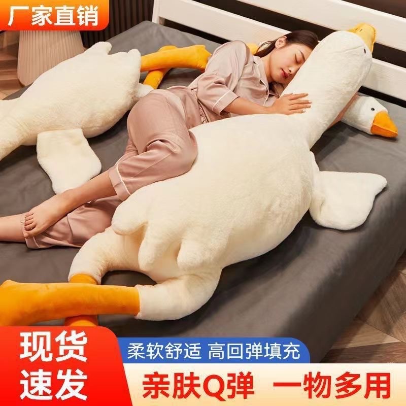 ネット赤の大きな白いガチョウのぬいぐるみの子供の女の子は寝て枕を抱いてかわいいガチョウに登ります。
