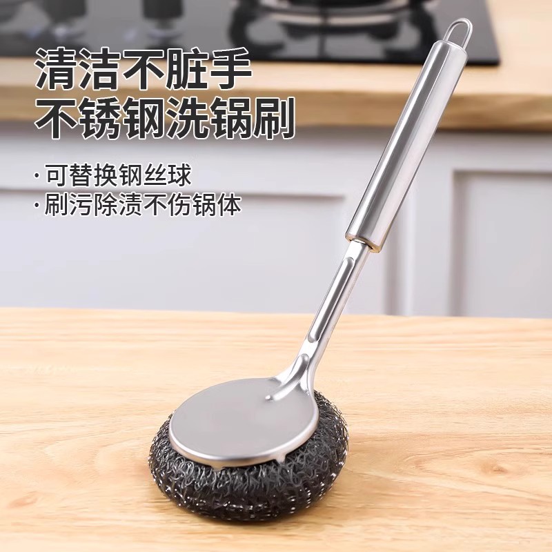 台所のステンレスの鍋は家庭の長い柄をブラシします。