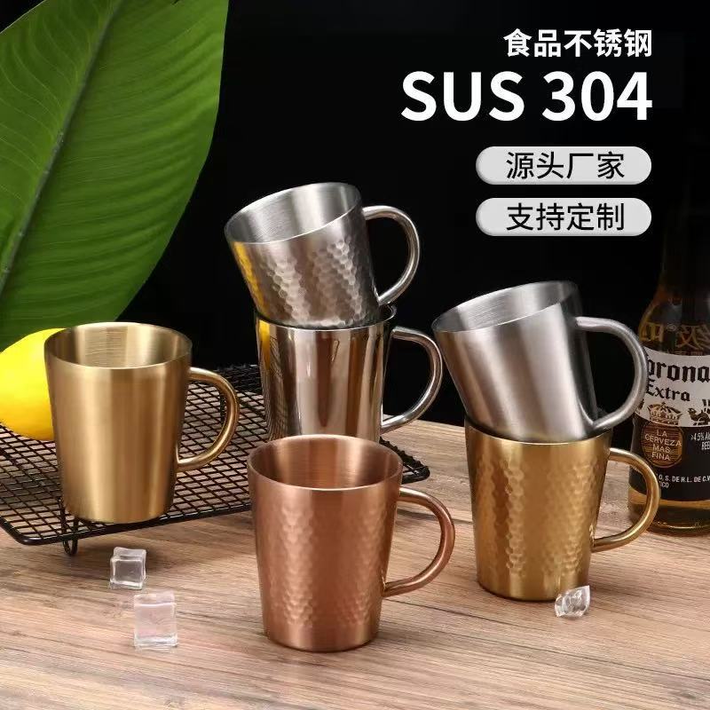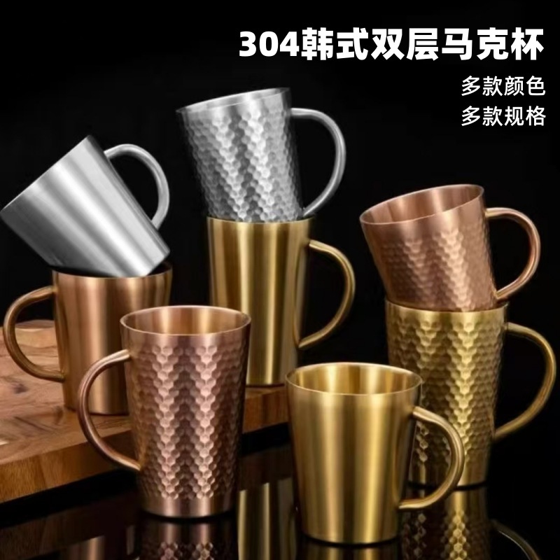 跨境创意韩式双层杯子巢纹带柄啤酒杯304不锈钢水杯餐厅咖啡水杯