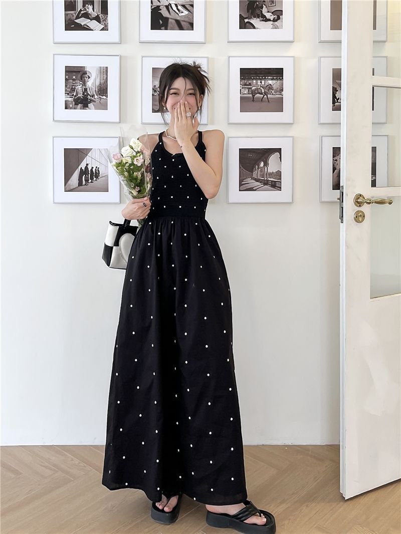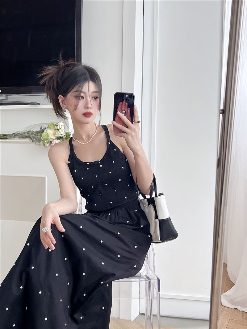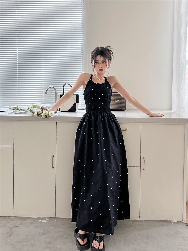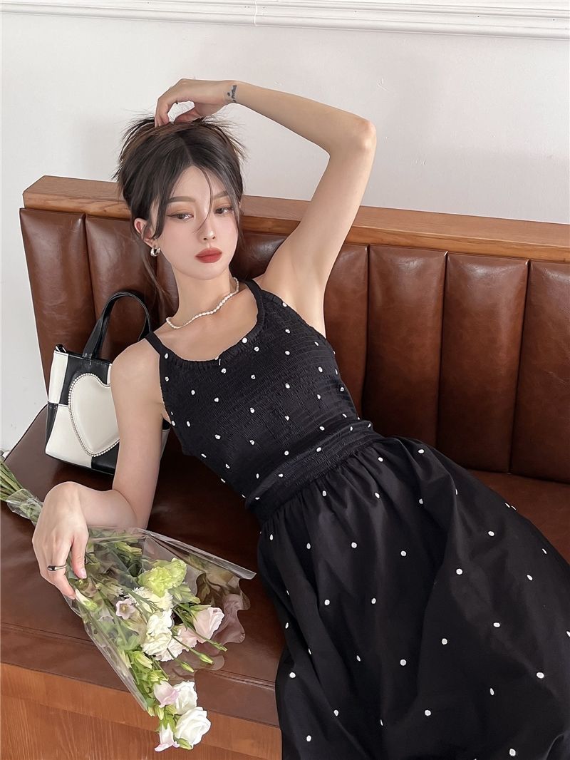 黒水玉サスペンダードレス女性の夏の新しいホットガールセクシーな純粋な欲望スタイルニッチレトロウエストロングスカート