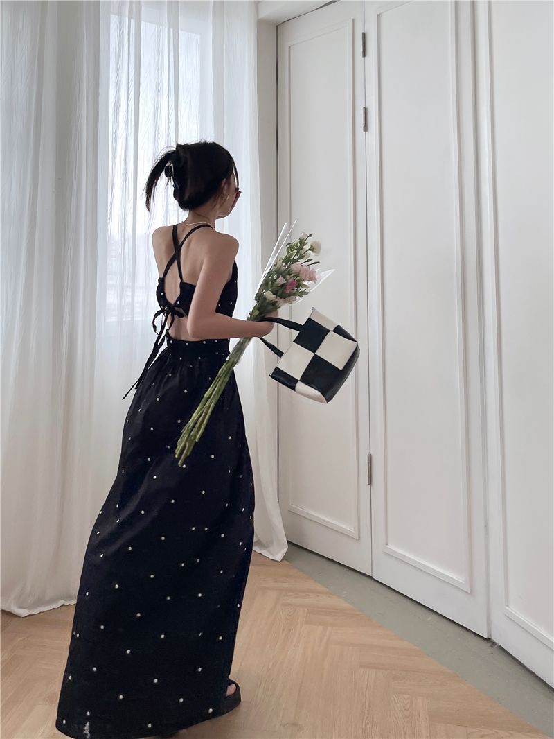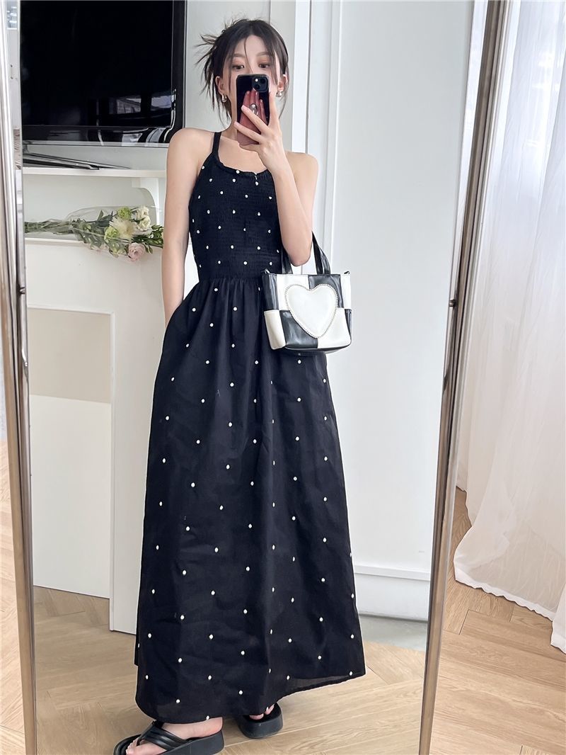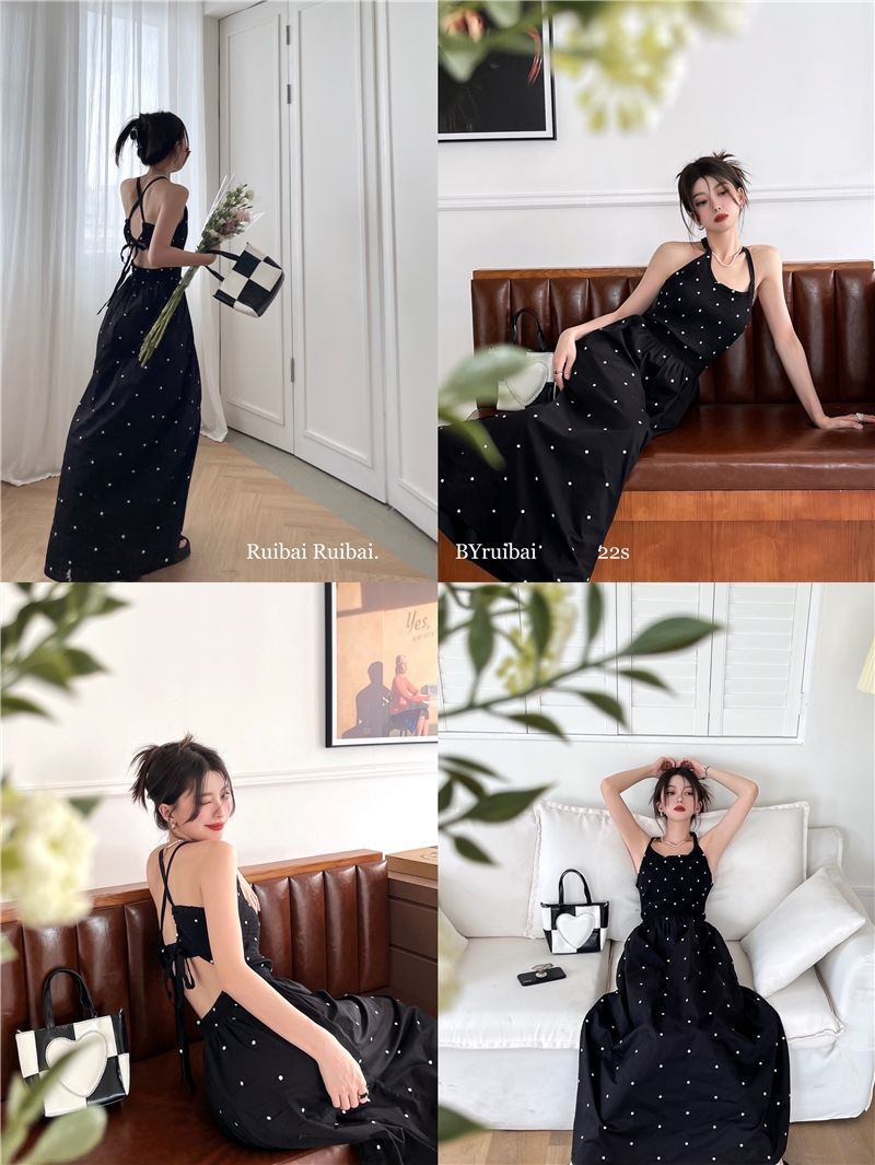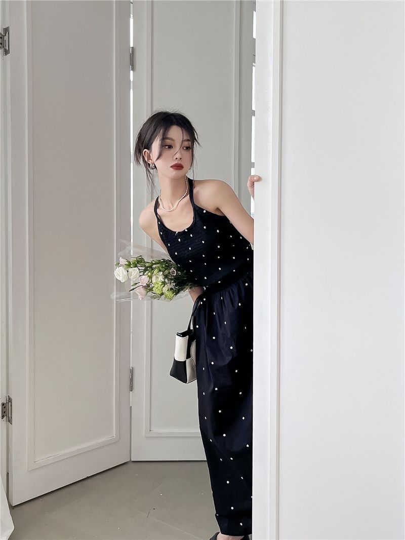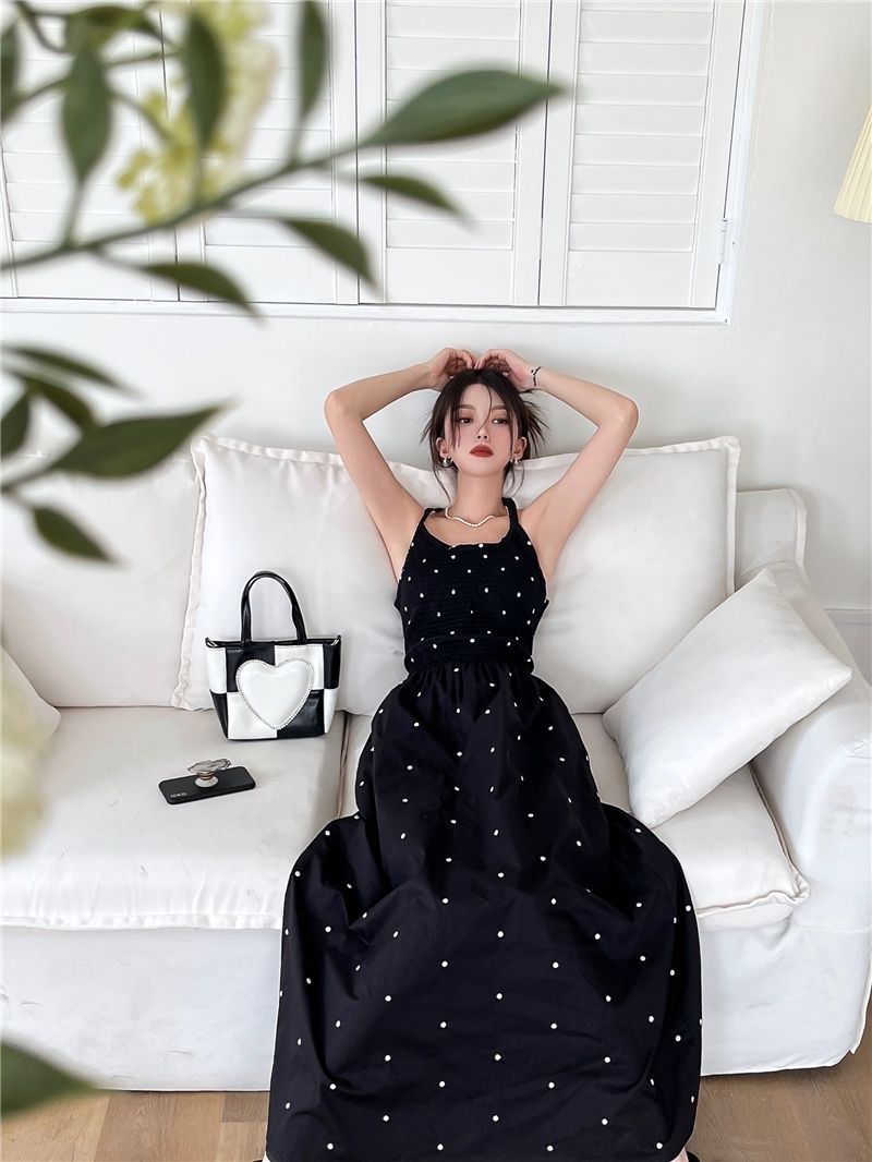 黒水玉サスペンダードレス女性の夏の新しいホットガールセクシーな純粋な欲望スタイルニッチレトロウエストロングスカート