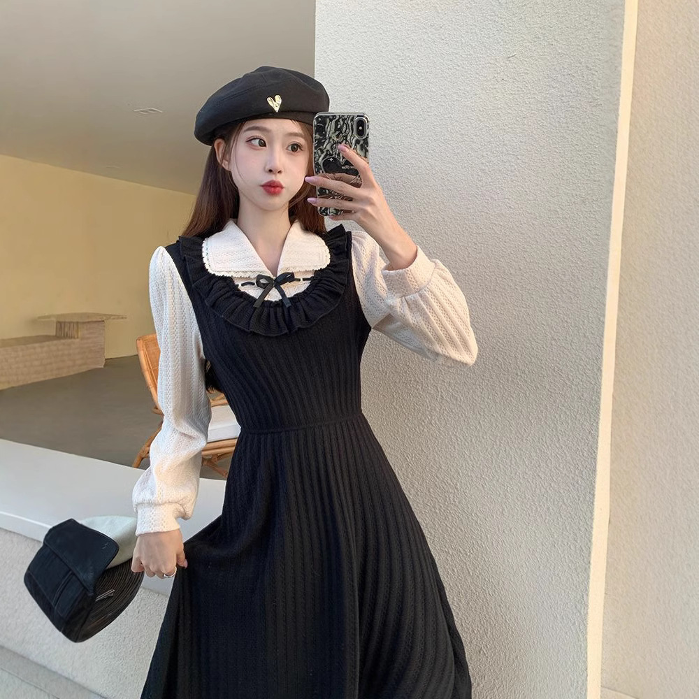 2025秋冬新作 フレンチスタイル パッチワーク 長袖 ミニ丈 ブラックドレス ヴィンテージ風 フェイクツーピース 細見え エレガントなワンピース トレンド