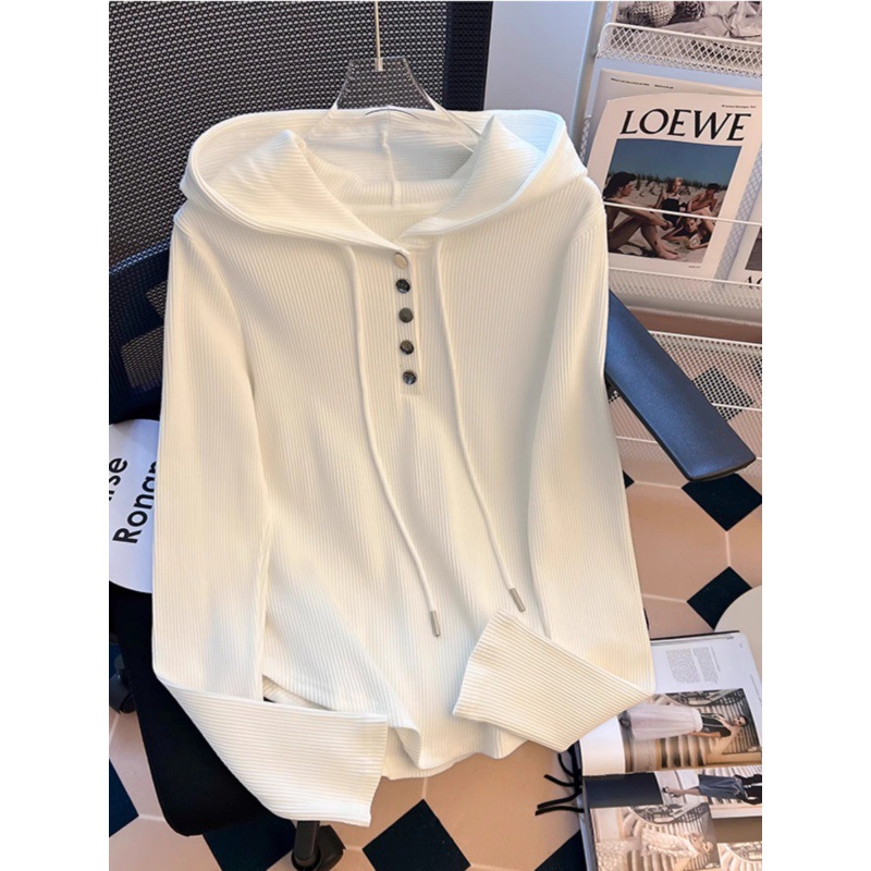 美式抽绳连帽长袖T恤女春秋季新款设计感修身白色打底百搭上衣潮