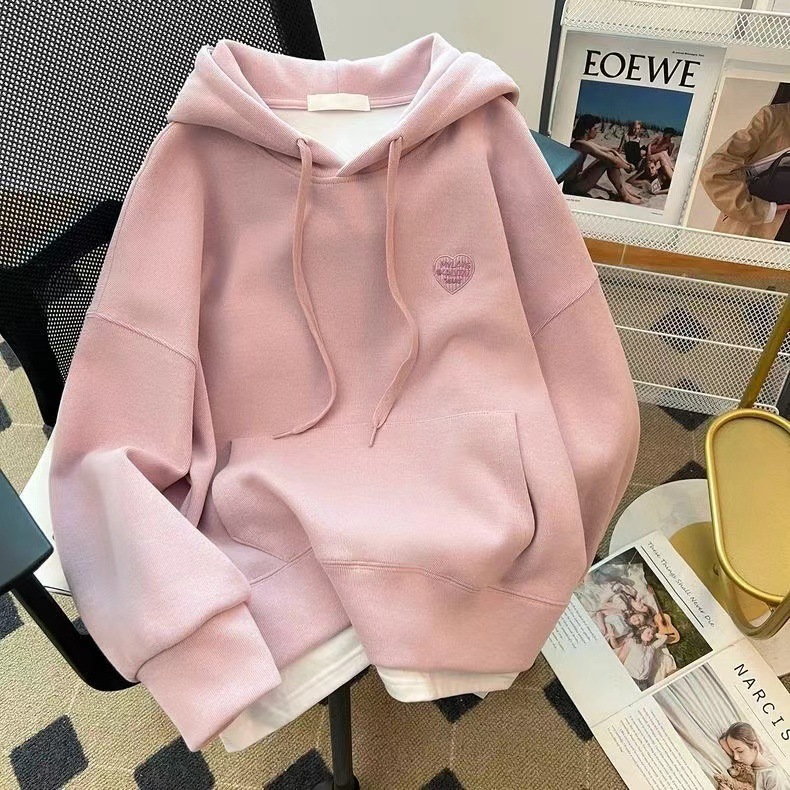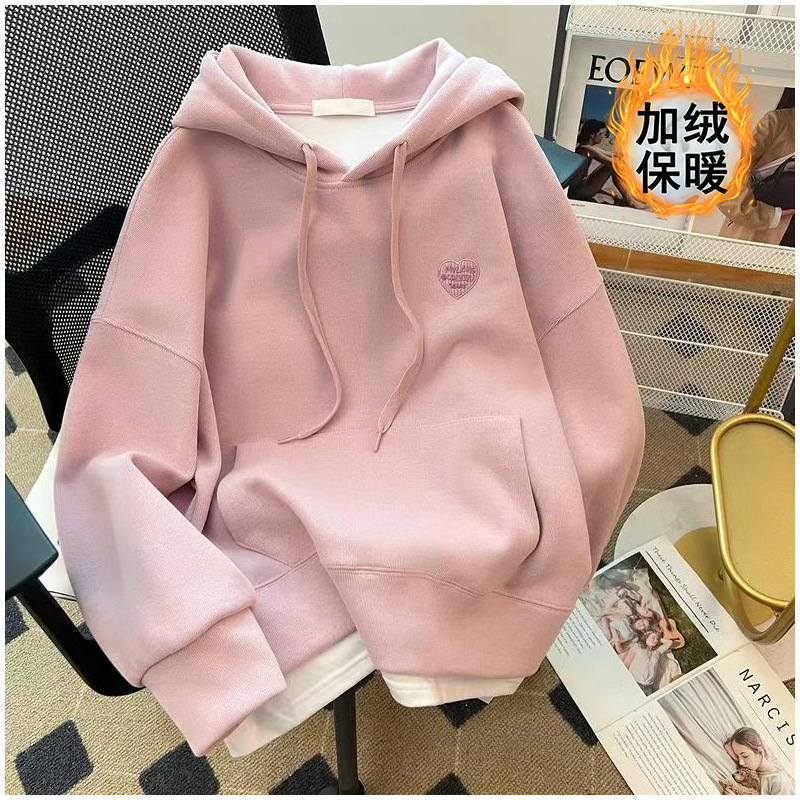 加绒加厚胖mm假两件连帽卫衣女春秋冬季时尚宽松慵懒风上衣外套潮