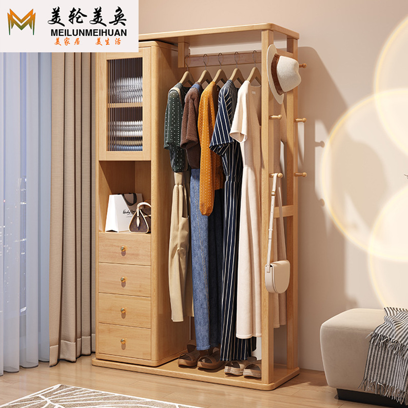 北欧橡胶木实木可旋转挂衣架带储物柜多功能落地穿衣镜一体衣帽架