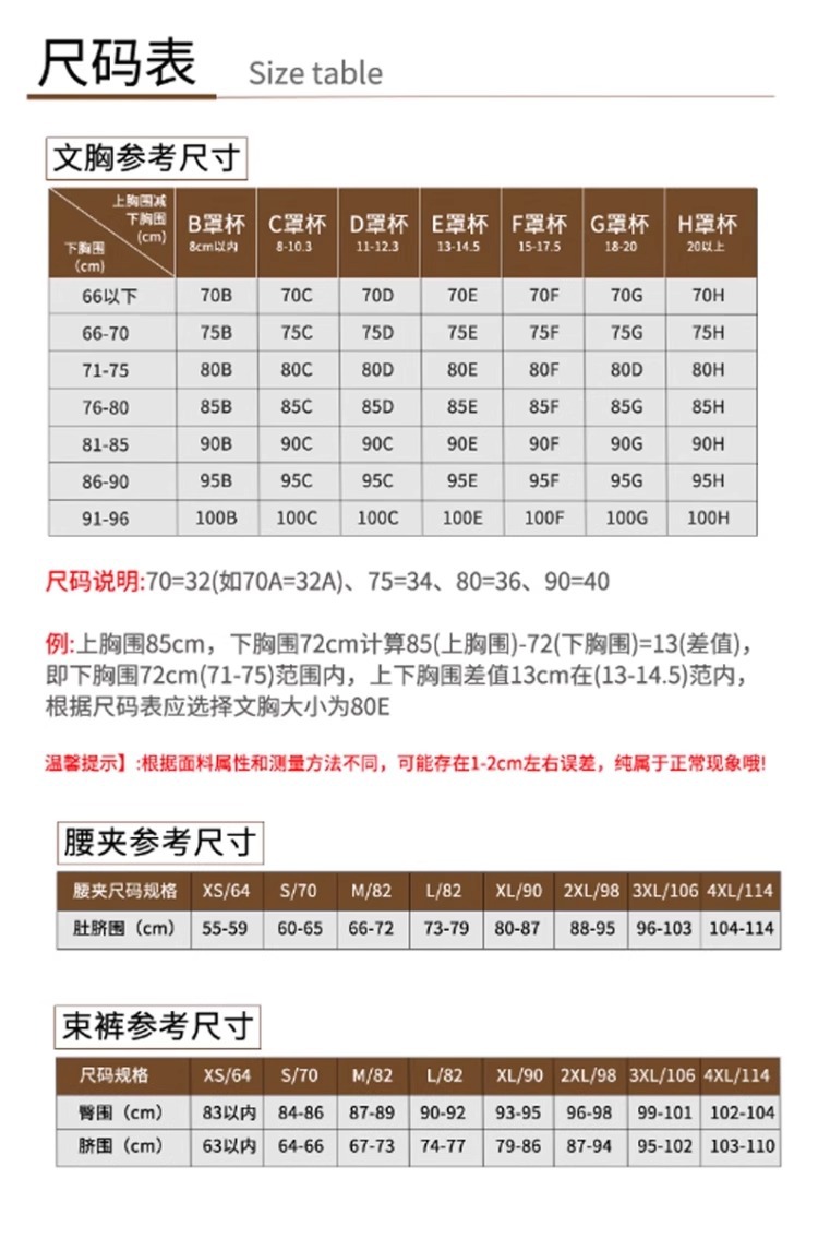 32B/70B,32C/70C,32D/70D,32E/70E,32F/70F,34B/75B,34C/75C,34D/75D,34E/75E,34F/75F,36B/80B,36C/80C,36D/80D,36E/80E,36F/80F,38B/85B,38C/85C,38D/85D,38E/85E,38F/85F,40B/90B,40C/90C,40D/90D,40E/90E,40F/90F,42B/95B,42C/95C,42D/95D,42E/95E,42F/95F,64 (推奨体重は 42.5kg 未満),70 (推奨体重 42.5-47.5kg),76 (推奨体重 47.5-52.5kg),82 (推奨体重 105-115),90 (推奨体重 57.5-65kg),98 (推奨体重 65-72.5kg),106 (推奨体重 72.5-80kg),114 (推奨体重 80-85kg),セットをご注文の際はブラジャーのサイズにご注意いただくか、カスタマーサービスまでお問い合わせください。