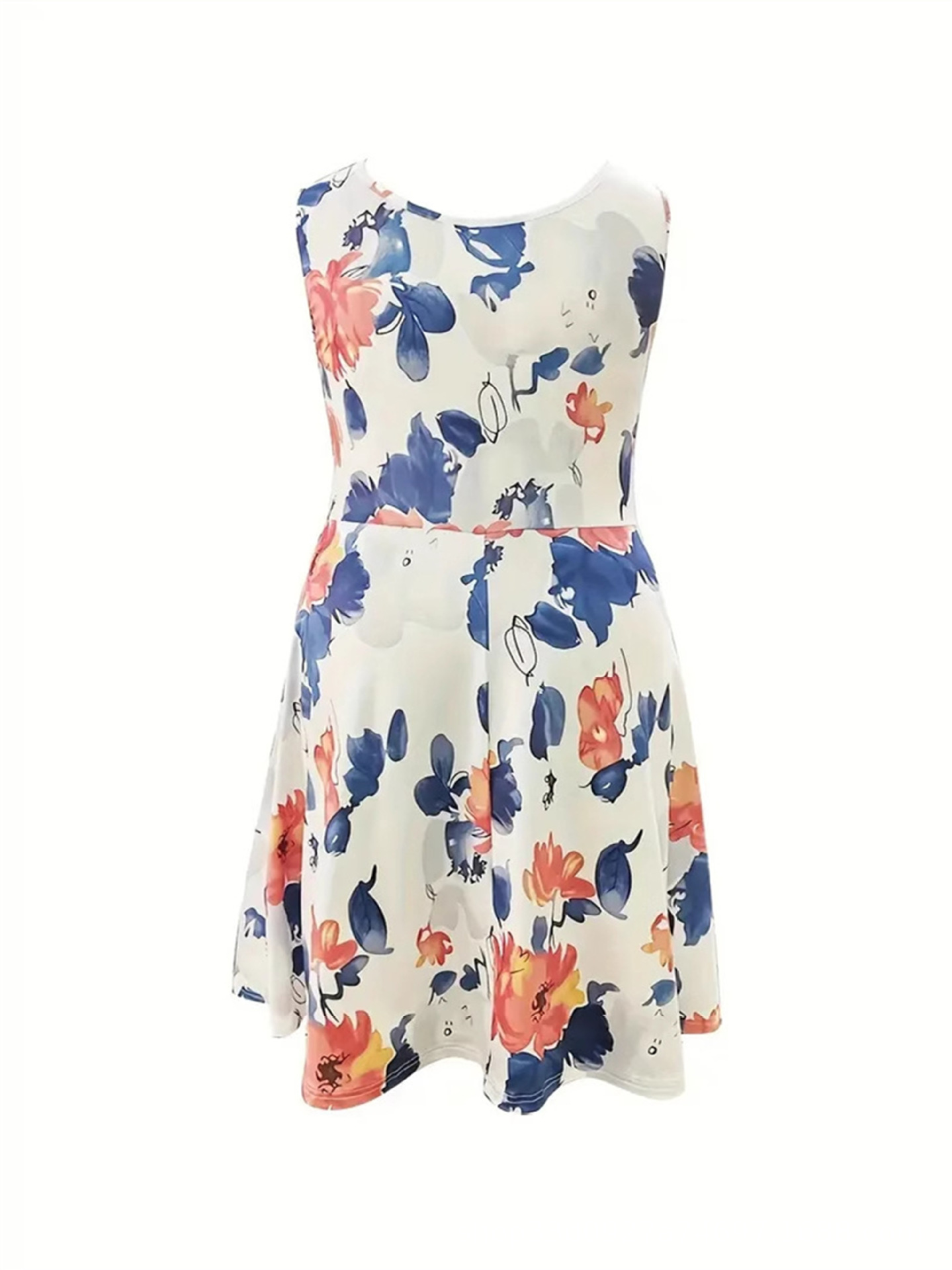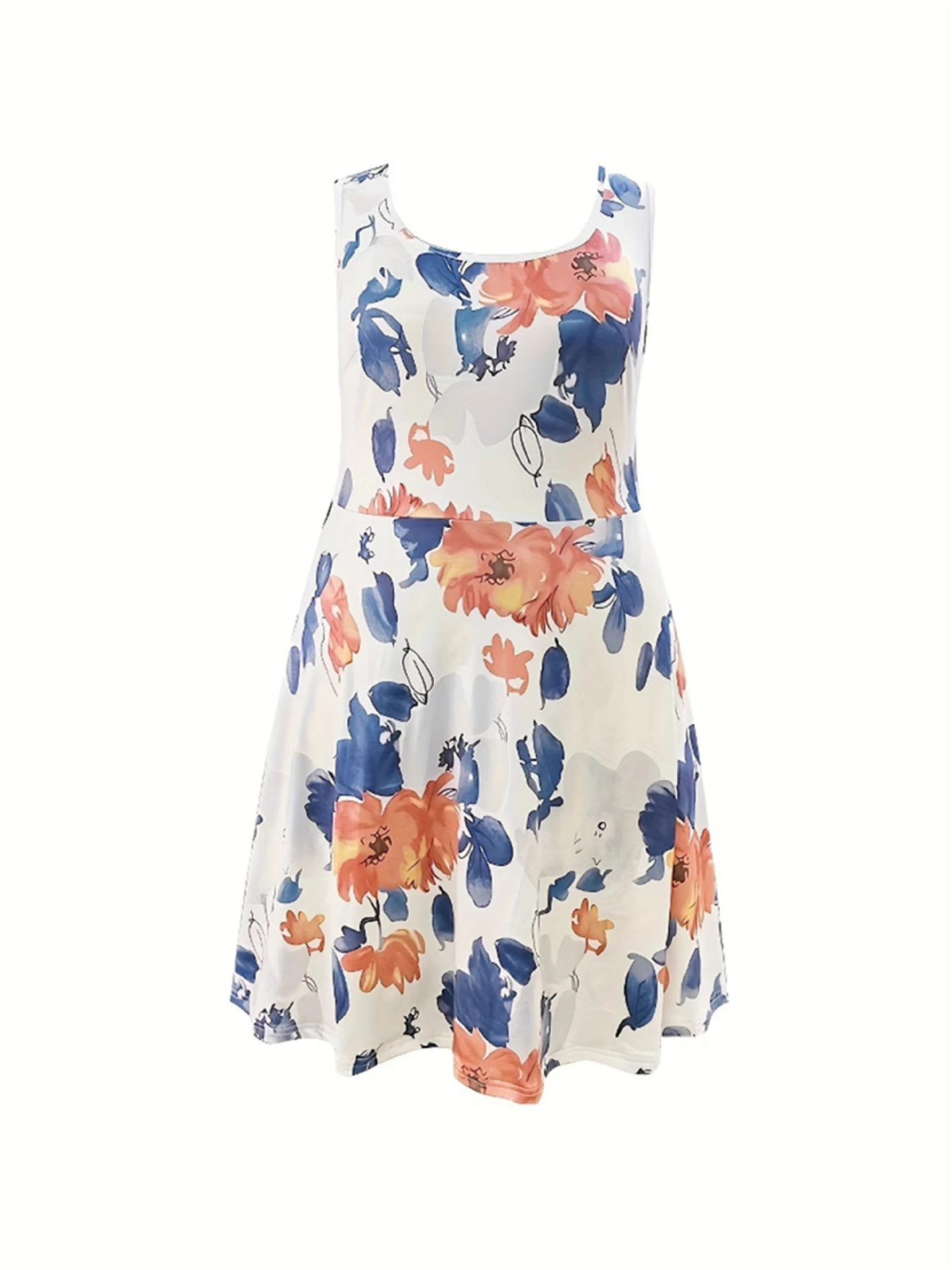 2025年 外貿在庫 大きいサイズ レディース カラフルプリント ラウンドネック ノースリーブワンピース 工場卸売 エレガントで上品