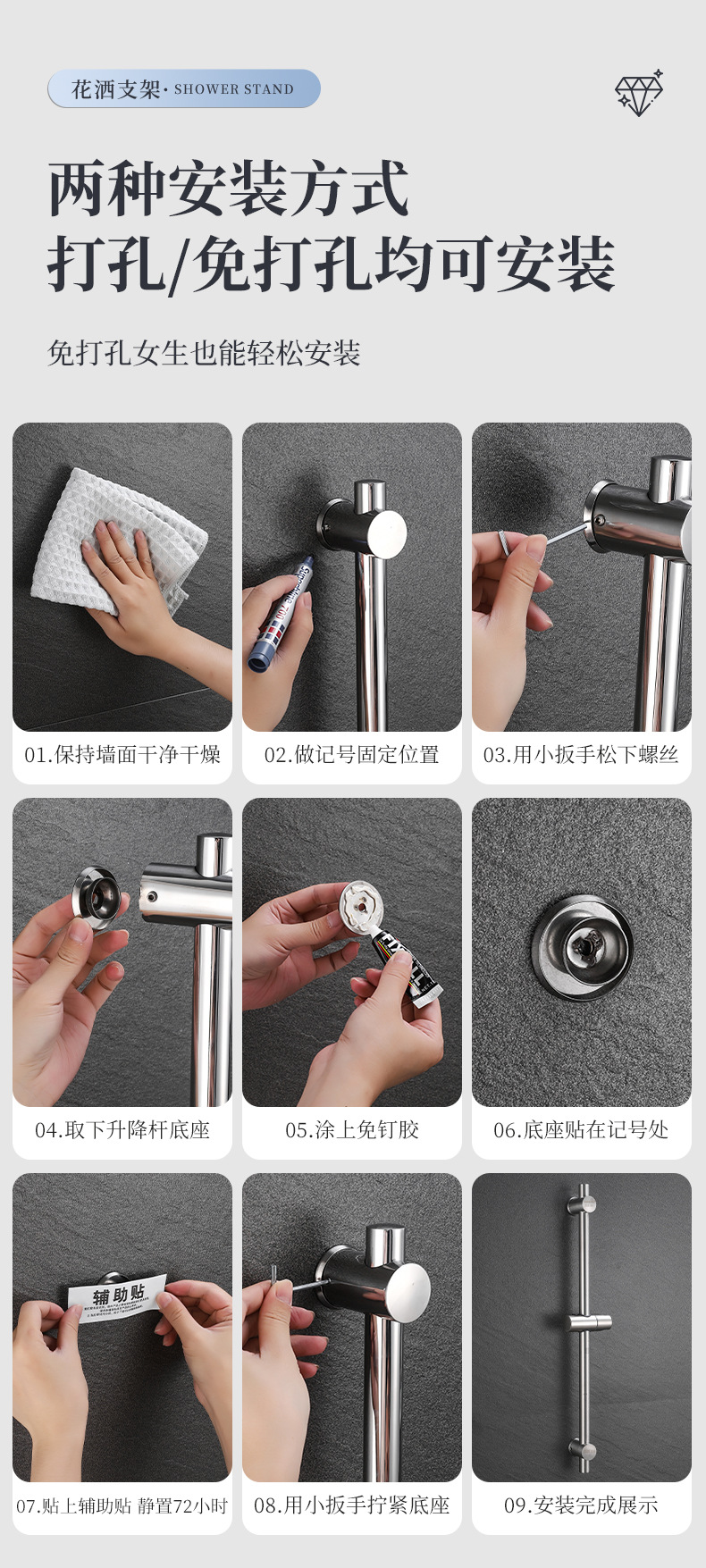 304ステンレス鋼穴なしシャワーバーシャワーシャワーヘッドリフターバー簡易黒色浴室シャワースタンドホテル