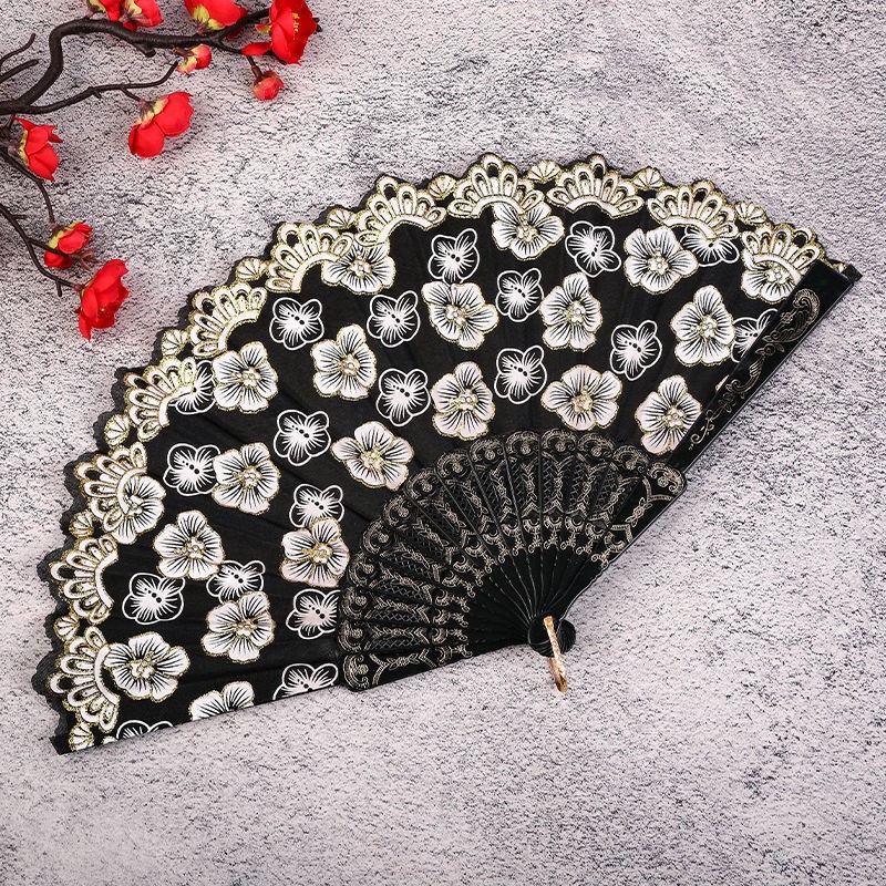 スペイン製黒レース扇子、金箔加工折りたたみ扇子、夏の中国風ダンス撮影用、卸売、自社生産販売