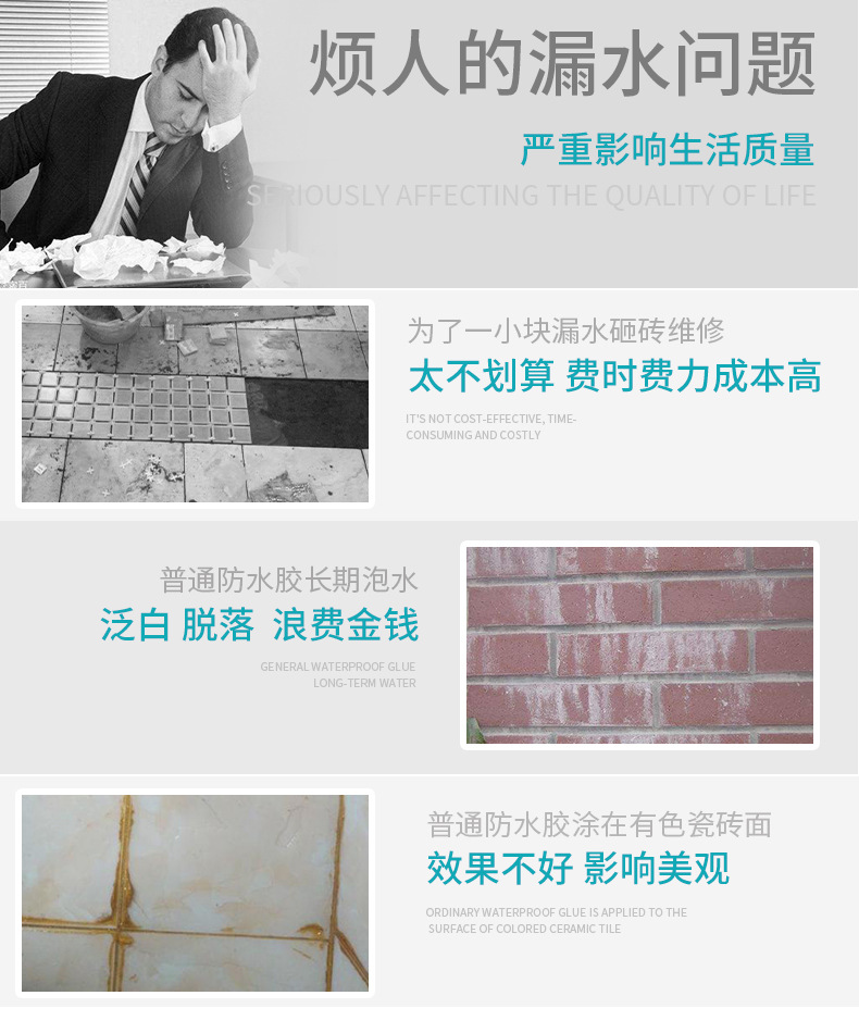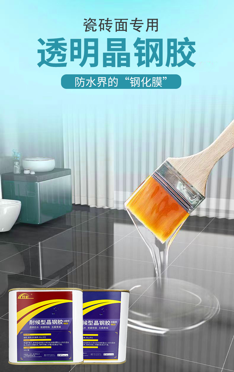 透明防水接着剤、外壁、内壁、タイル表面、浴室、キッチンの窓枠、耐浸透性、防湿性、耐破砕性、タイル不要の防水コーティング