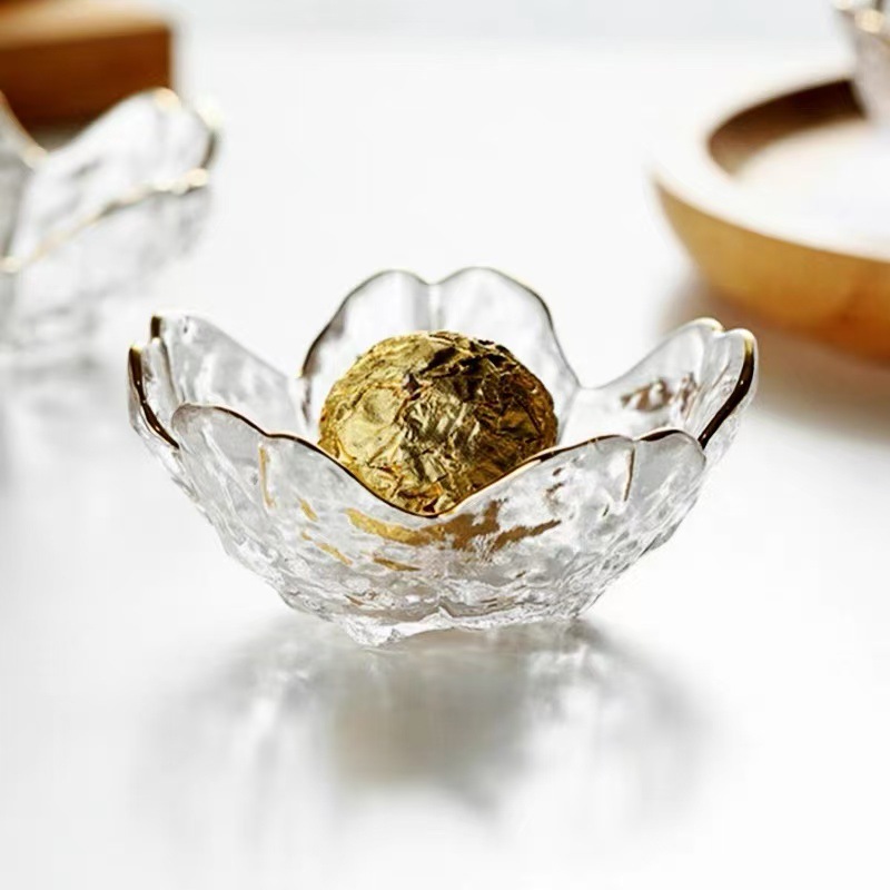 フルーツボウル日本式ガラスサラダボウル金辺かわいいシングルデザートボウル家庭用小皿ハンマー桜花びらボウル