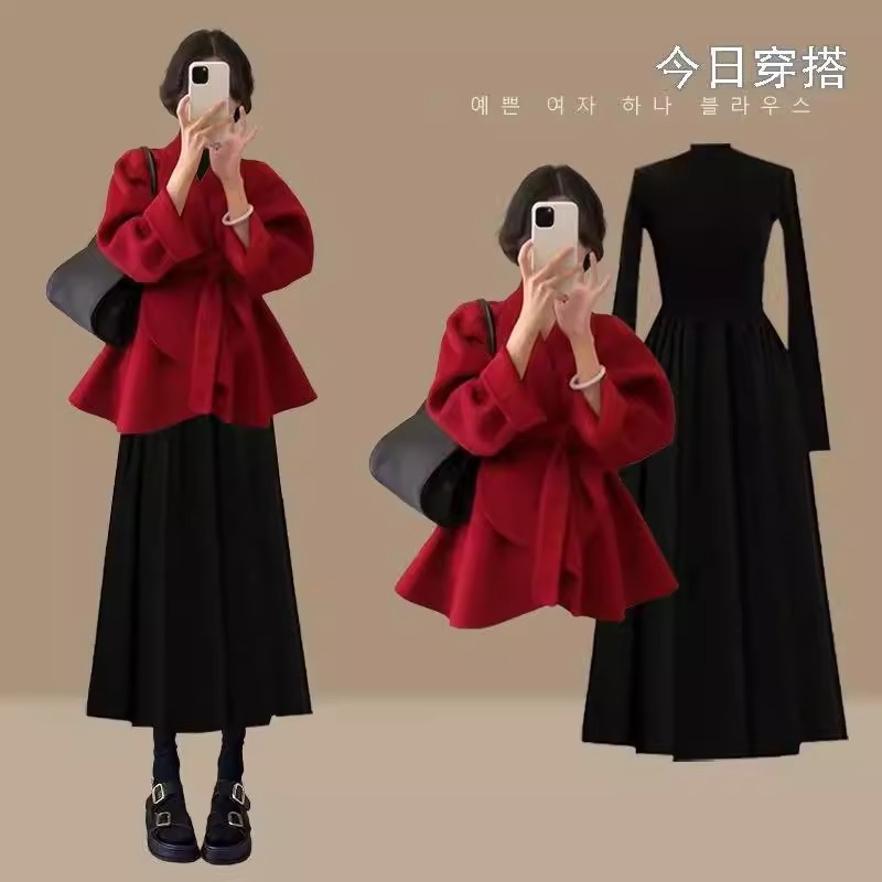 春のセットは女性2025の新しい高級感のある赤いニットセーターのスカートの2つのセットを着ています