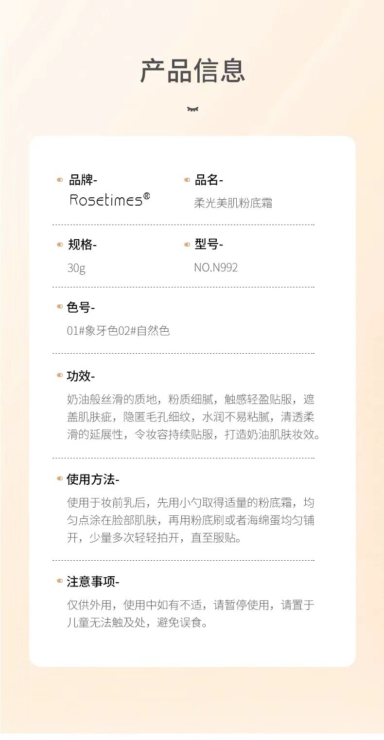 产品名称 Rosetimes柔光美肌粉底霜NO.N992