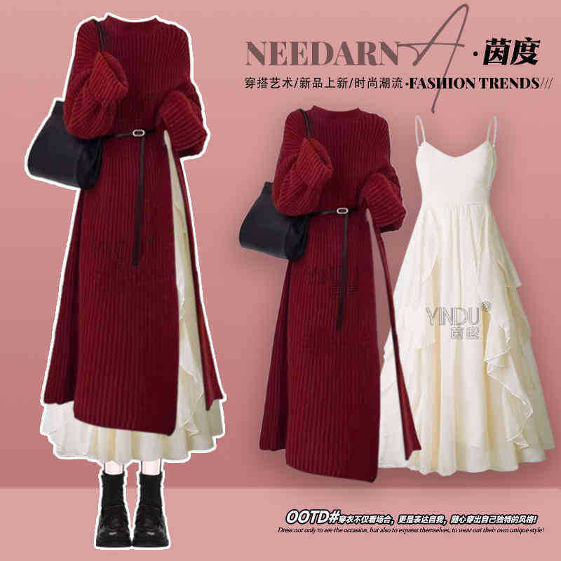 春のセットは女性2025の新しい高級感のある赤いニットセーターのスカートの2つのセットを着ています