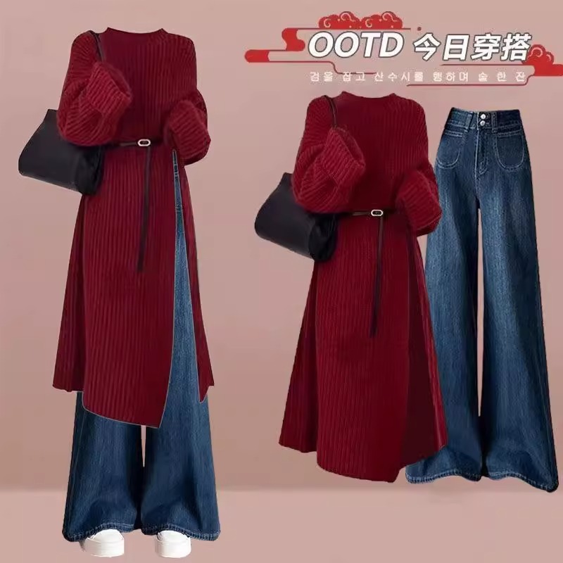 复古减龄春季女装套装新款大码长款洋气红色毛衣阔腿牛仔裤两件套