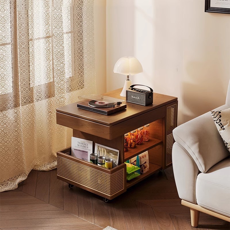 多機能無垢材モバイル昇降式コーヒーテーブルソファトロリー小さなリビングルームシンプルなサイドキャビネット回転