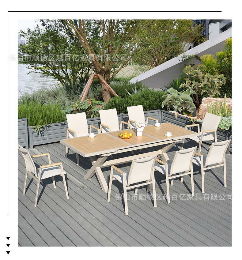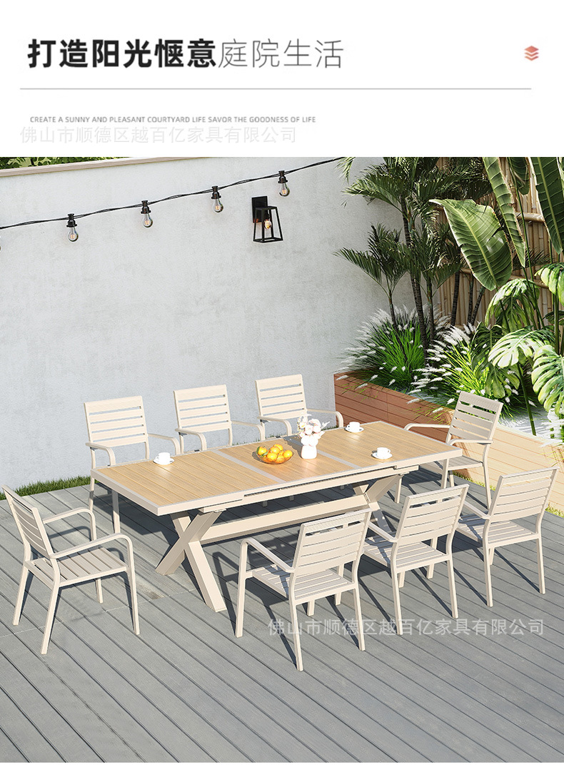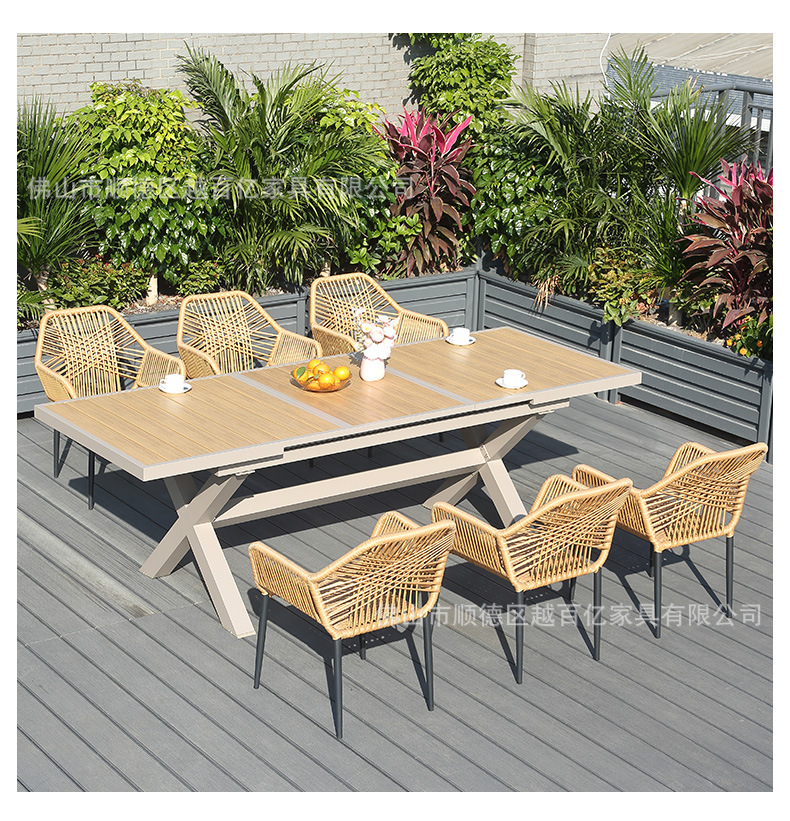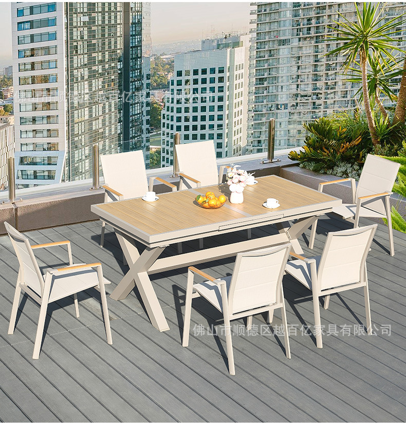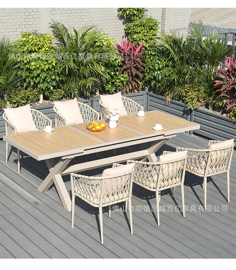 屋外防水オールアルミニウム大型ロングテーブル中庭ヴィラガーデン伸縮式ダイニングテーブルと椅子の組み合わせプラスチックウッドオープンエアヤード屋外