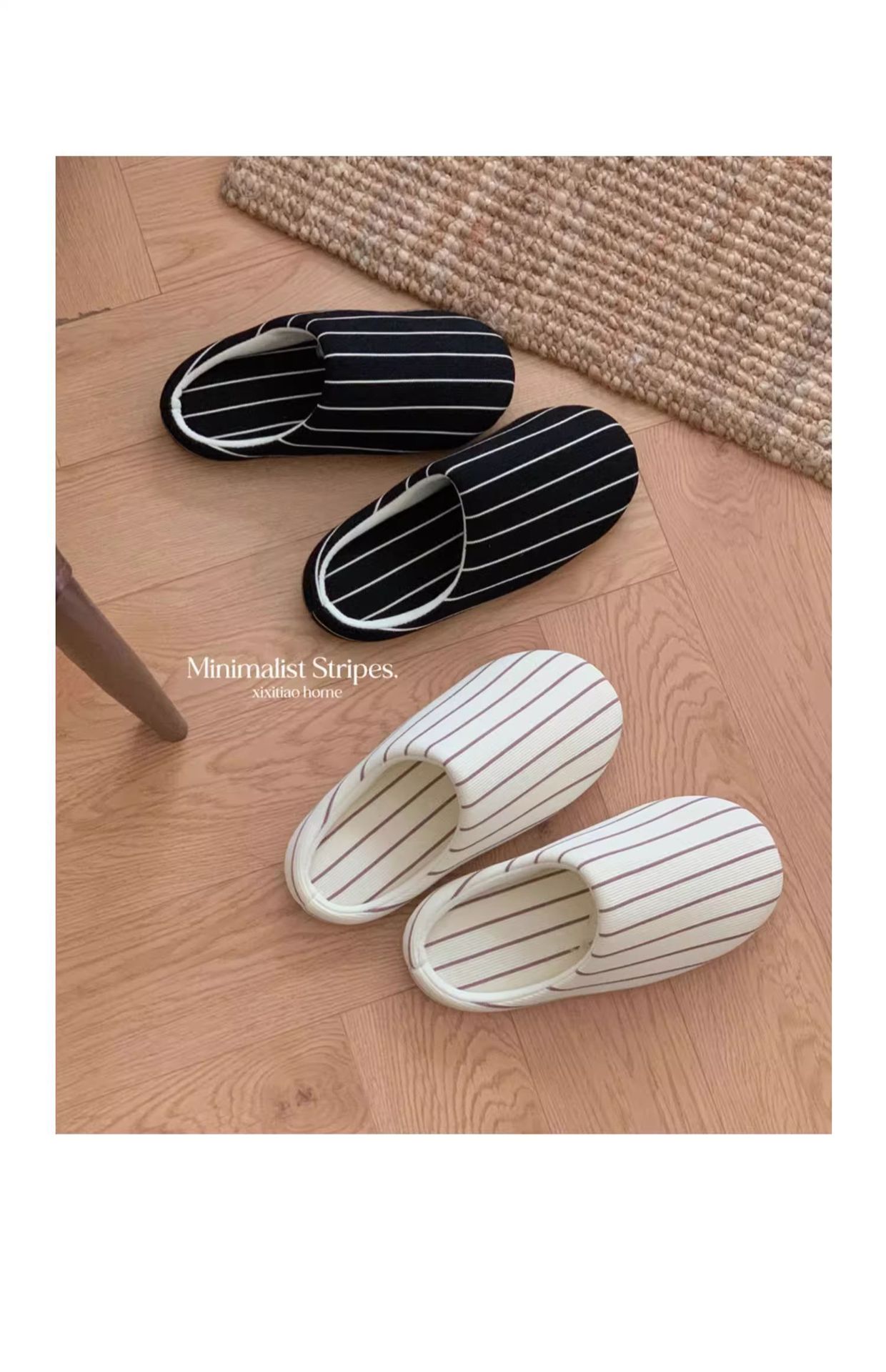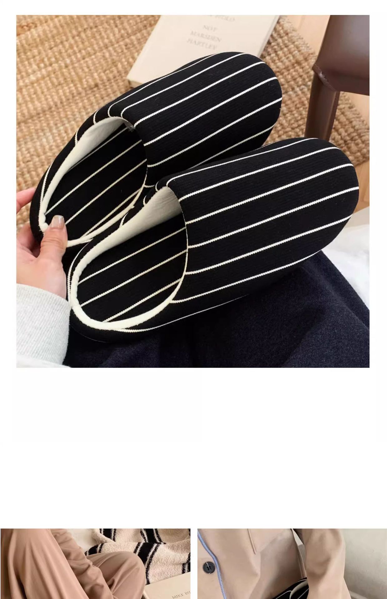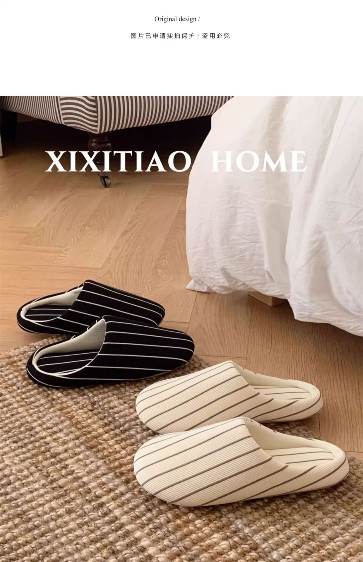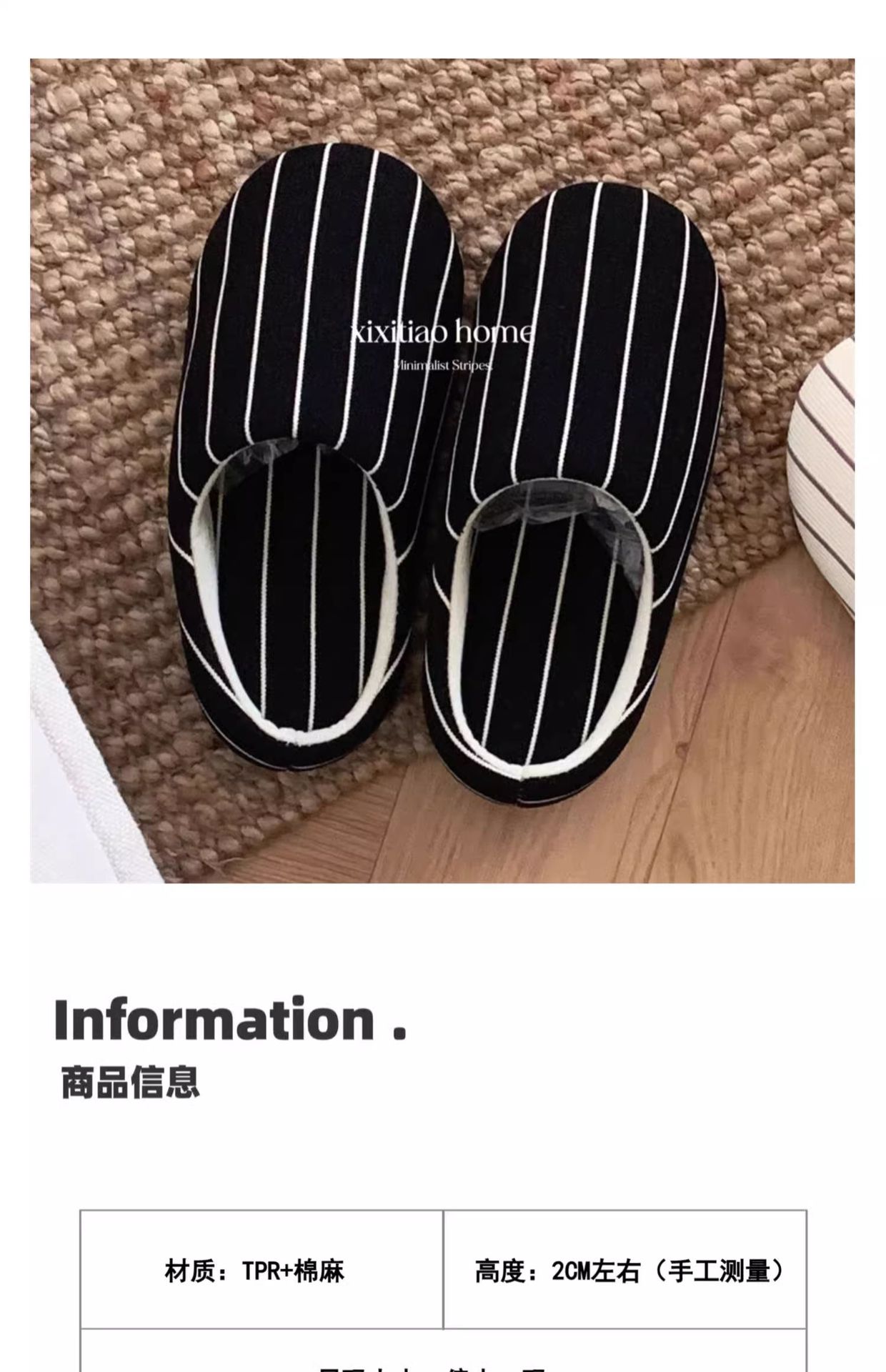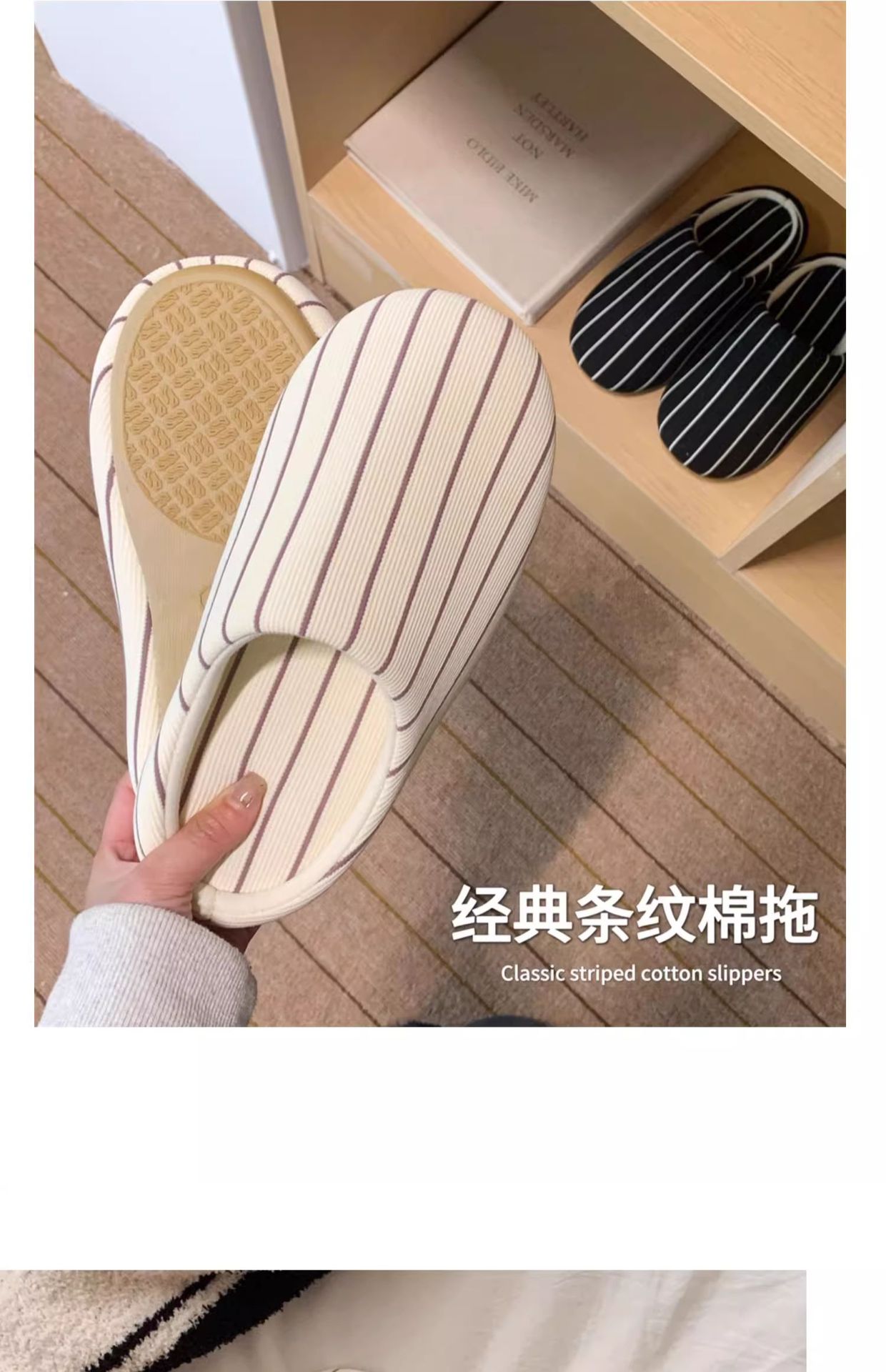 秋冬简约风男女士复古撞色条纹情侣棉拖鞋居家舒适新款棉麻地板鞋