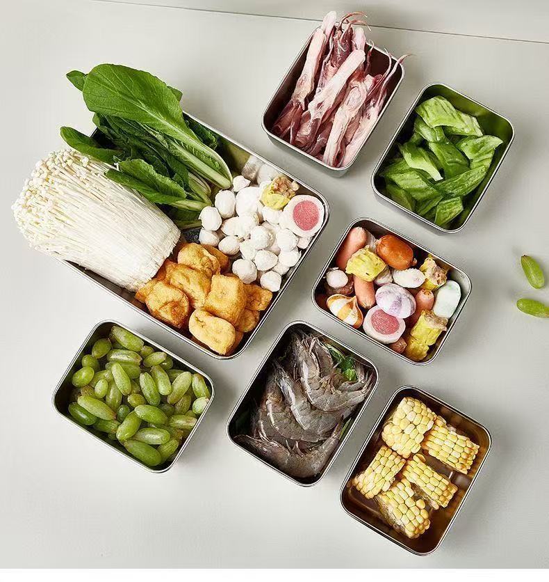 食品級のステンレス製の新鮮な箱を並べて野の弁当箱の長方形の多用途の箱の冷蔵庫の収納箱を並べて料理を分けて箱を詰めます。