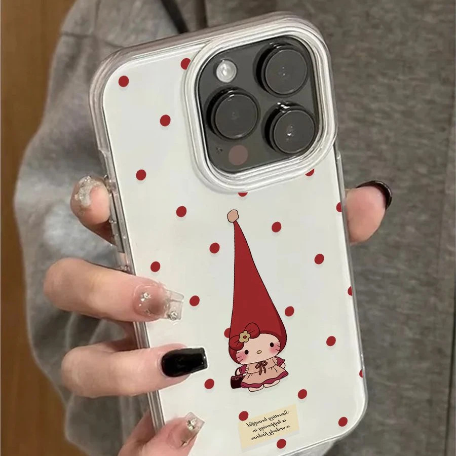 水玉模様の尖った帽子をかぶったキティ猫 iPhone17/16promax用スマホケース、Apple 15対応、白地、imd14/12対応
