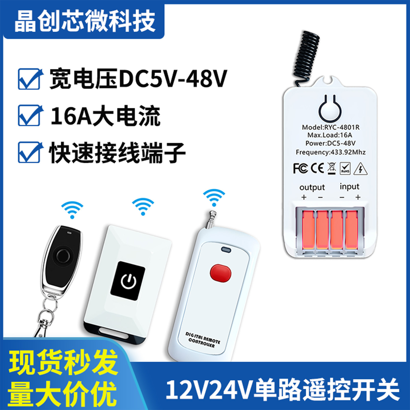 DC12V24V48V单路无线远程遥控开关433MHz远距离遥控器LED灯通断器