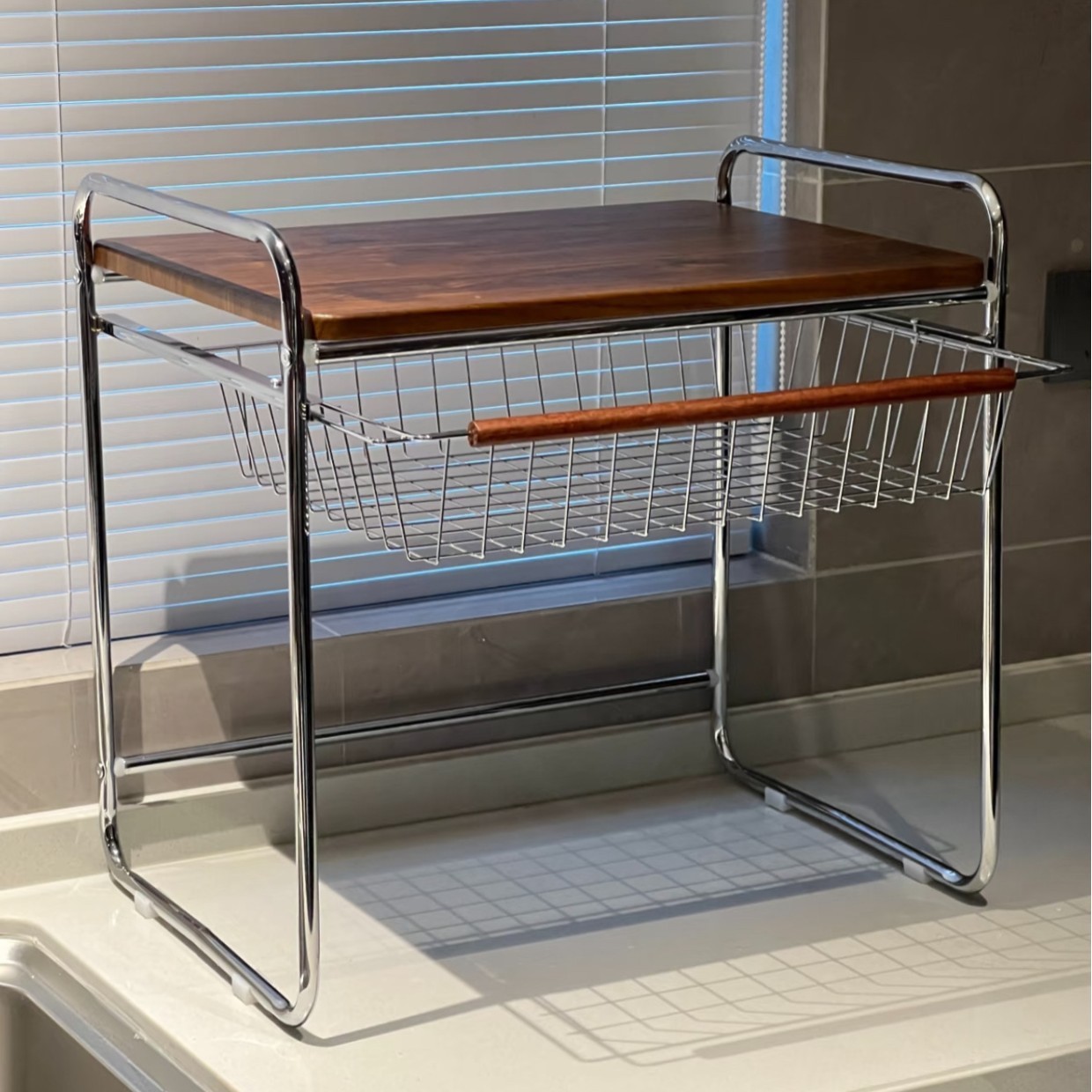 中世スタイルの家庭用電子レンジ収納ラック、バスケット付きキッチンカウンタートップ収納ラック、炊飯器デスクトップ収納ラック
