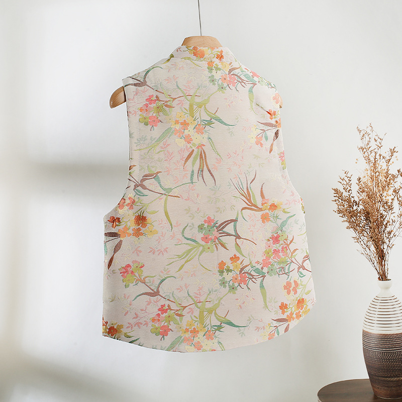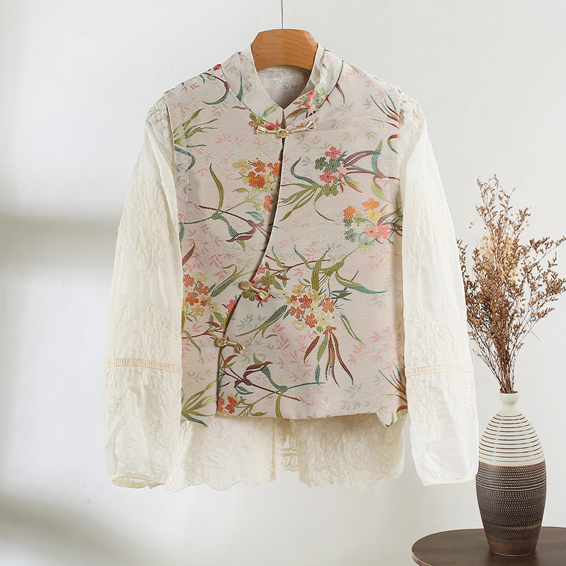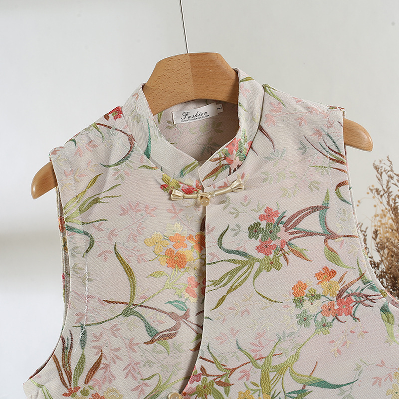 2025年の春の新型の新中国式のバックルの肩の上着の国風の馬の甲の婦人服の馬のベストの百合の袖なし