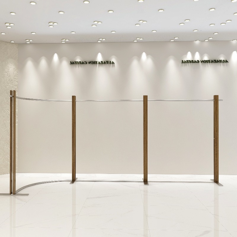 衣料品店ディスプレイラック床置きアイランドラック中世スタイルステンレス鋼クルミ色ディスプレイラック婦人服店洋服ラック