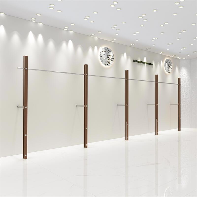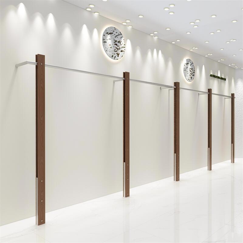 洋服店の壁の展示棚の中古風婦人服店の専用ハンガーのステンレスの胡桃色の陳列道具店